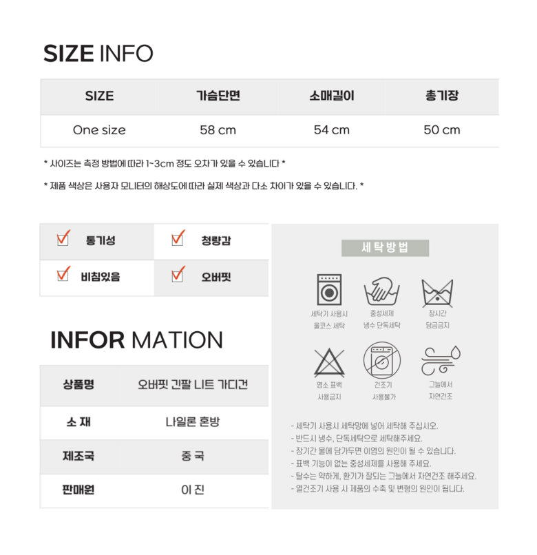 | 제조국 | 중국 | 세탁방법 및 취급시 주의사항 | 상품 상세페이지 참조 |