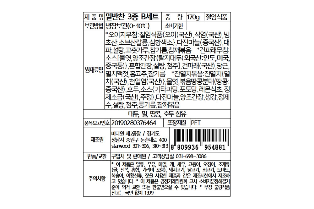 | 제품명 | 밑반찬 3종 B세트 | 식품의 유형 | 컨텐츠 참조 |