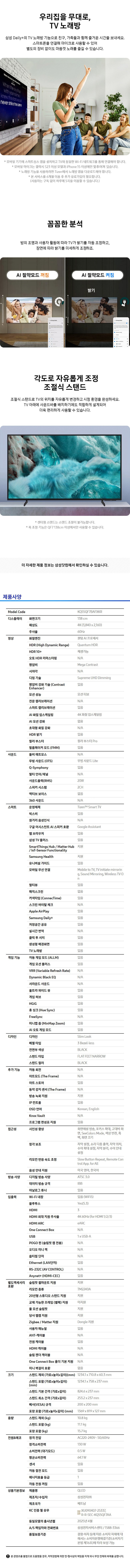 | 품명 및 모델명 | TV/ KQ55QF7BAFXKR | KC 인증정보 | 본품: XU090407-25337A, R-R-SEC-KQ55QF7AA, 특정소출력 무선기기: R-C-SEC-WCD730M |