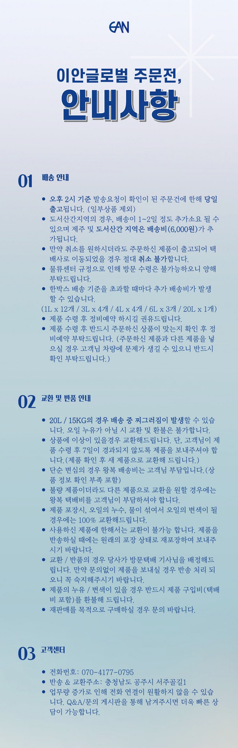 | 배송방법 | 순차배송 | 배송비 | 무료배송 · 도서산간 추가 배송비 - 제주 지역: 5,000원 - 도서산간 지역: 5,000원 |
