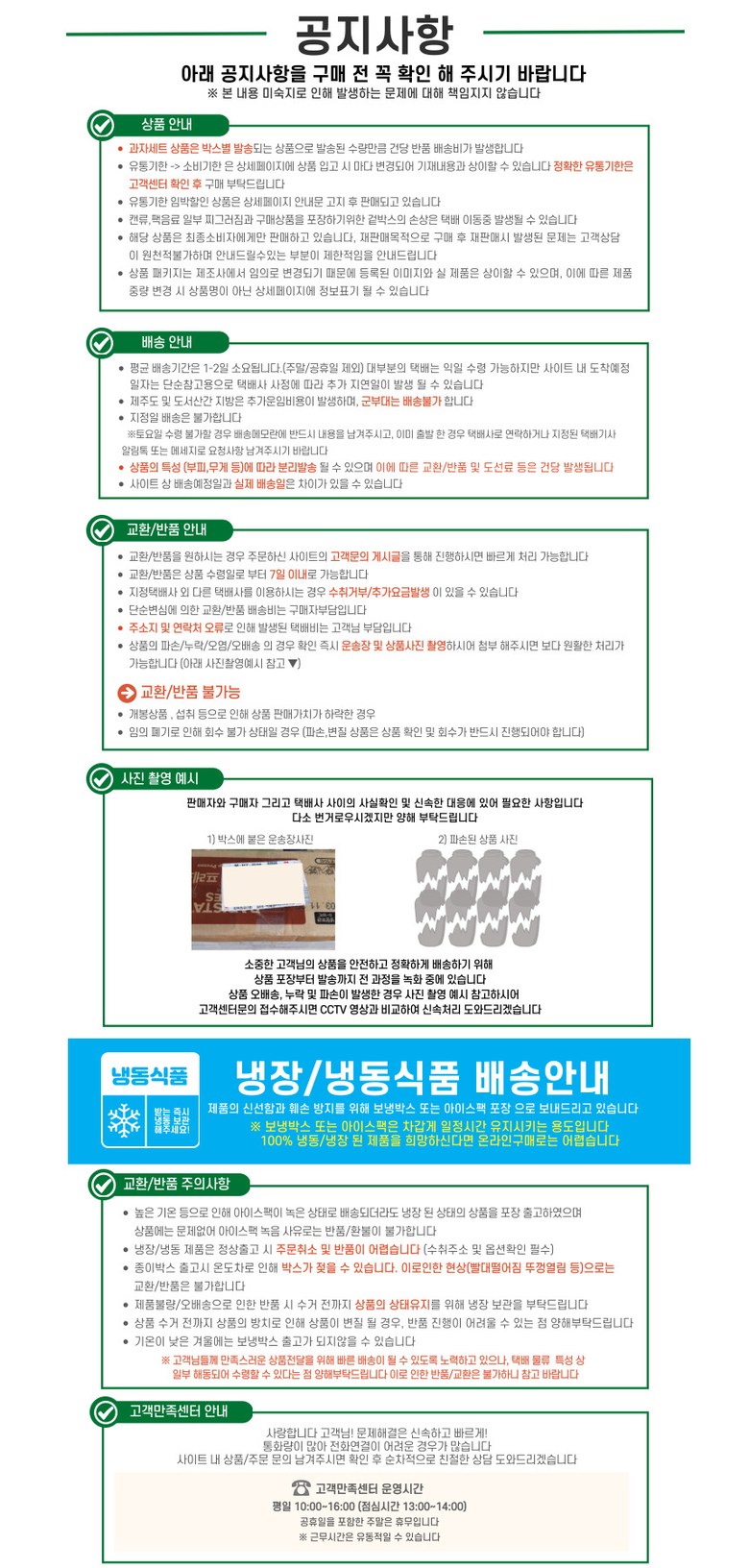 - ㆍ모니터 해상도의 차이로 인해 색상이나 이미지가 실제와 달라, 고객이 단순 변심으로 교환/반품을 무료로 요청하는 경우