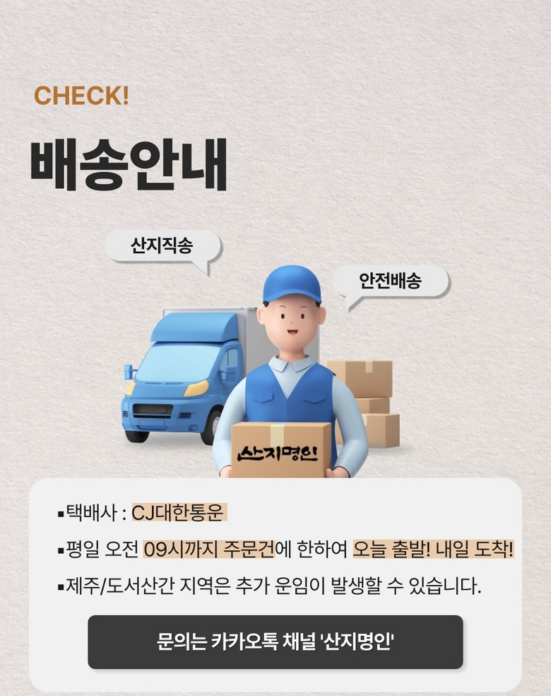| 배송기간 | ㆍ도서산간 지역 등은 배송에 3-5일이 더 소요될 수 있습니다. - 천재지변, 물량 수급 변동 등 예외적인 사유 발생 시, 다소 지연될 수 있는 점 양해 부탁드립니다. | ||
