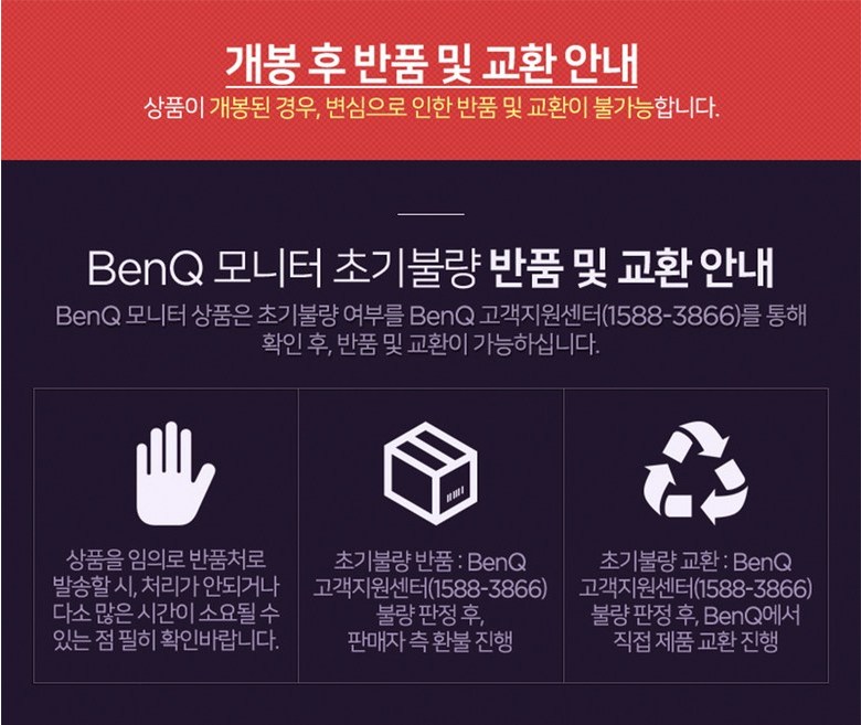 | 교환/반품 신청 기준일 | ㆍ단순변심에 의한 교환/반품은 제품 수령 후 7일 이내까지, 교환/반품 제한사항에 해당하지 않는 경우에만 가능 (배송비용과 교환/반품 비용 왕복배송비 고객부담) ㆍ상품의 내용이 표시·광고의 내용과 다른 경우에는 상품을 수령한 날부터 3개월 이내, 그 사실을 안 날 또는 알 수 있었던 날부터 |