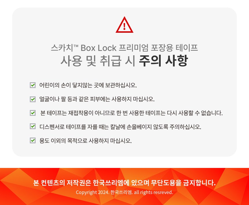 | 품명 및 모델명 | 스카치 박스락 포장용 테이프 #195 48mm x 20m | 인증/허가 사항 | 해당없음 |