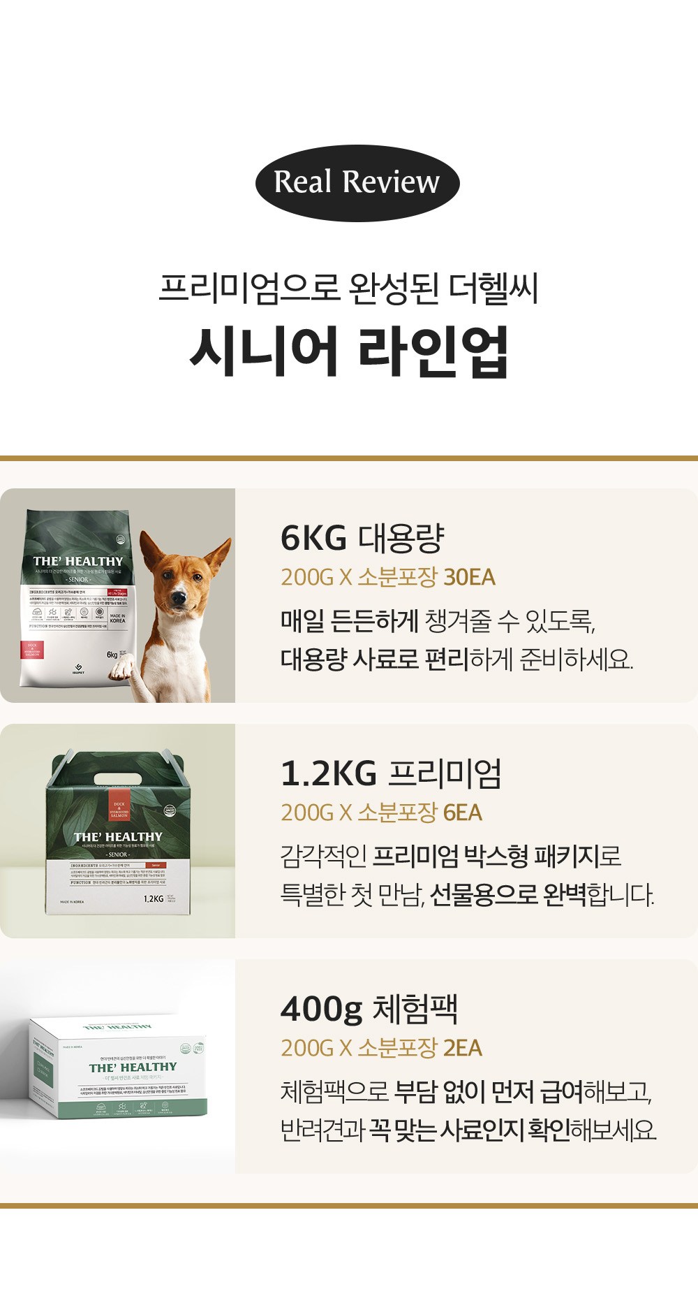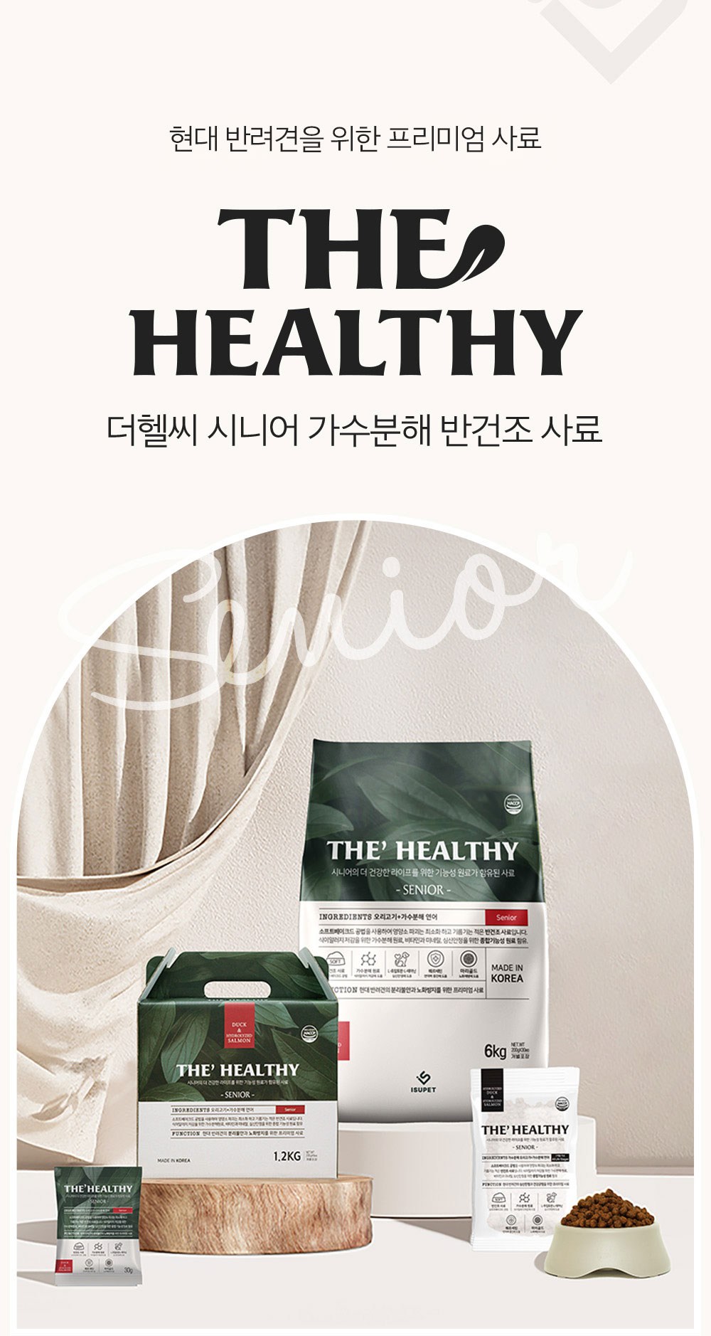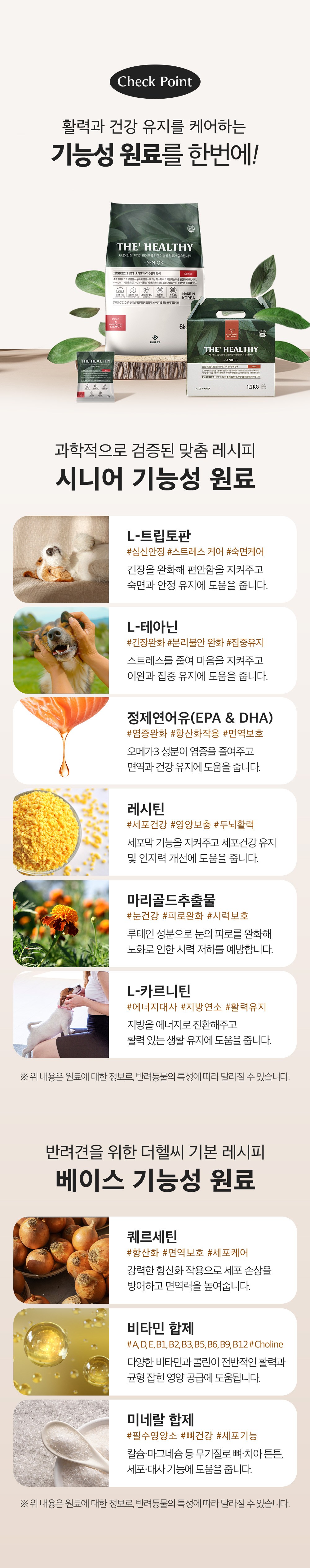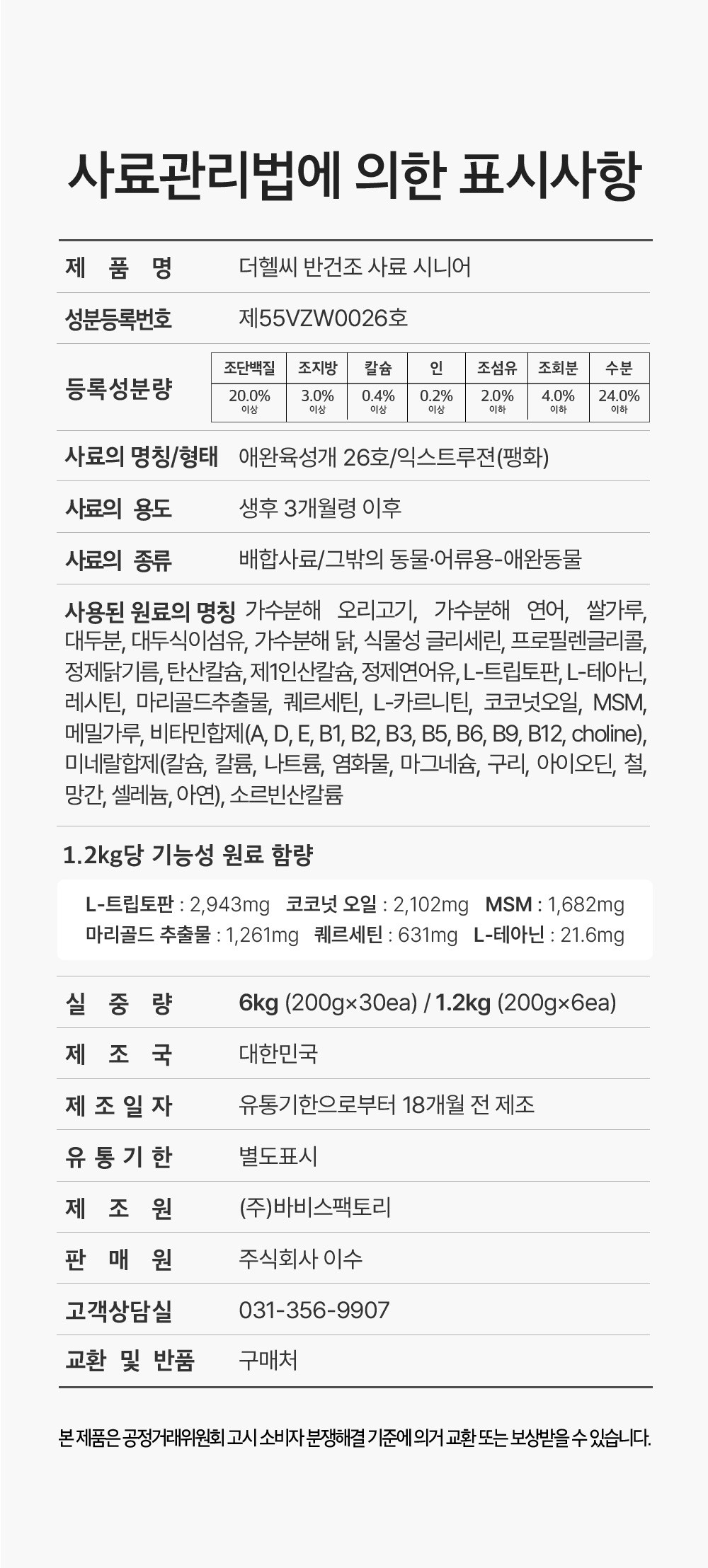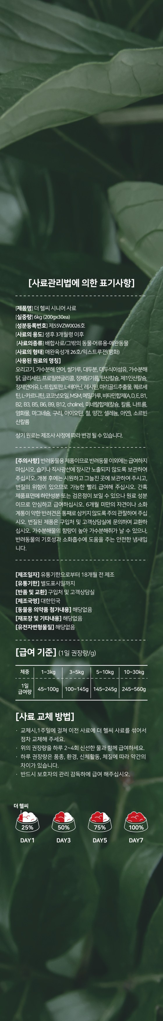 | 품명 및 모델명 | 더 헬씨 시니어 사료 | 인증/허가 사항 | 사료관리법에 따른 성분등록번호 : 컨텐츠 참조 |