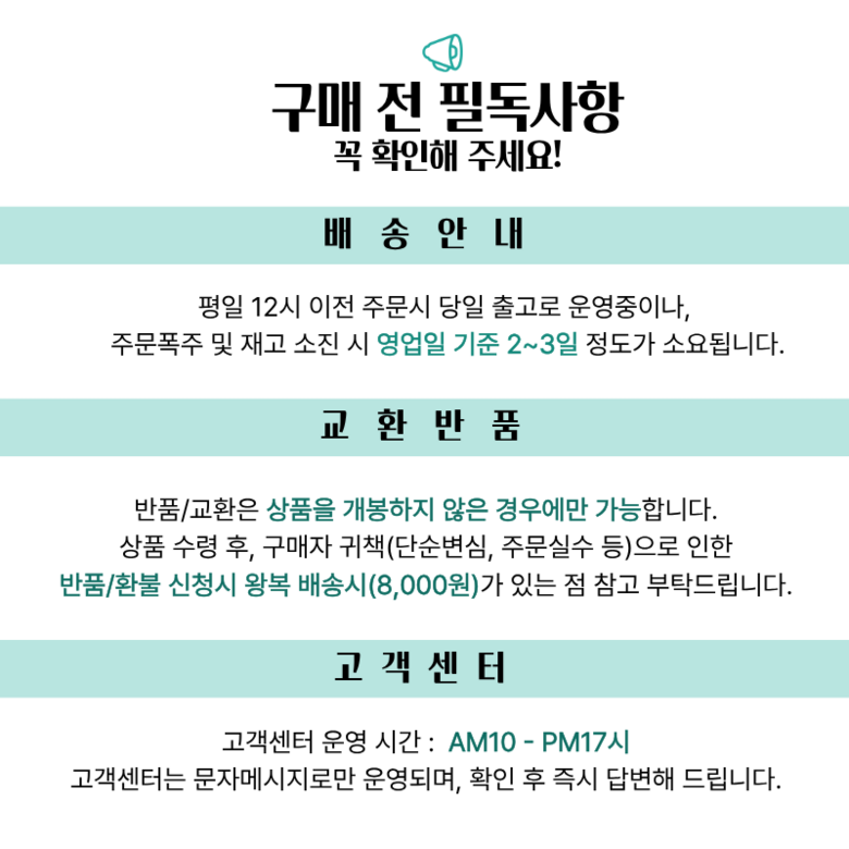 | 교환/반품 비용 (왕복비용) | 8,000원 - 단, 고객 변심의 경우에만 발생 - 도서산간 지역 배송불가 |