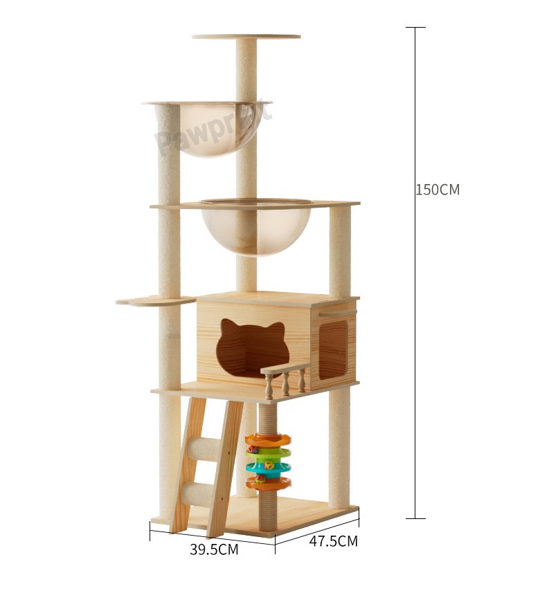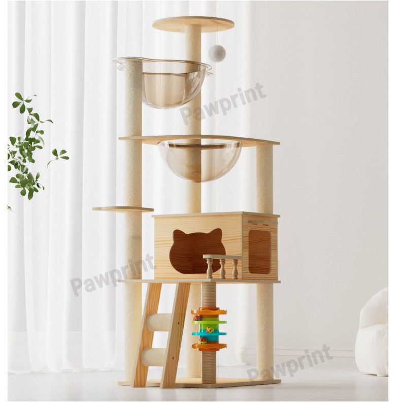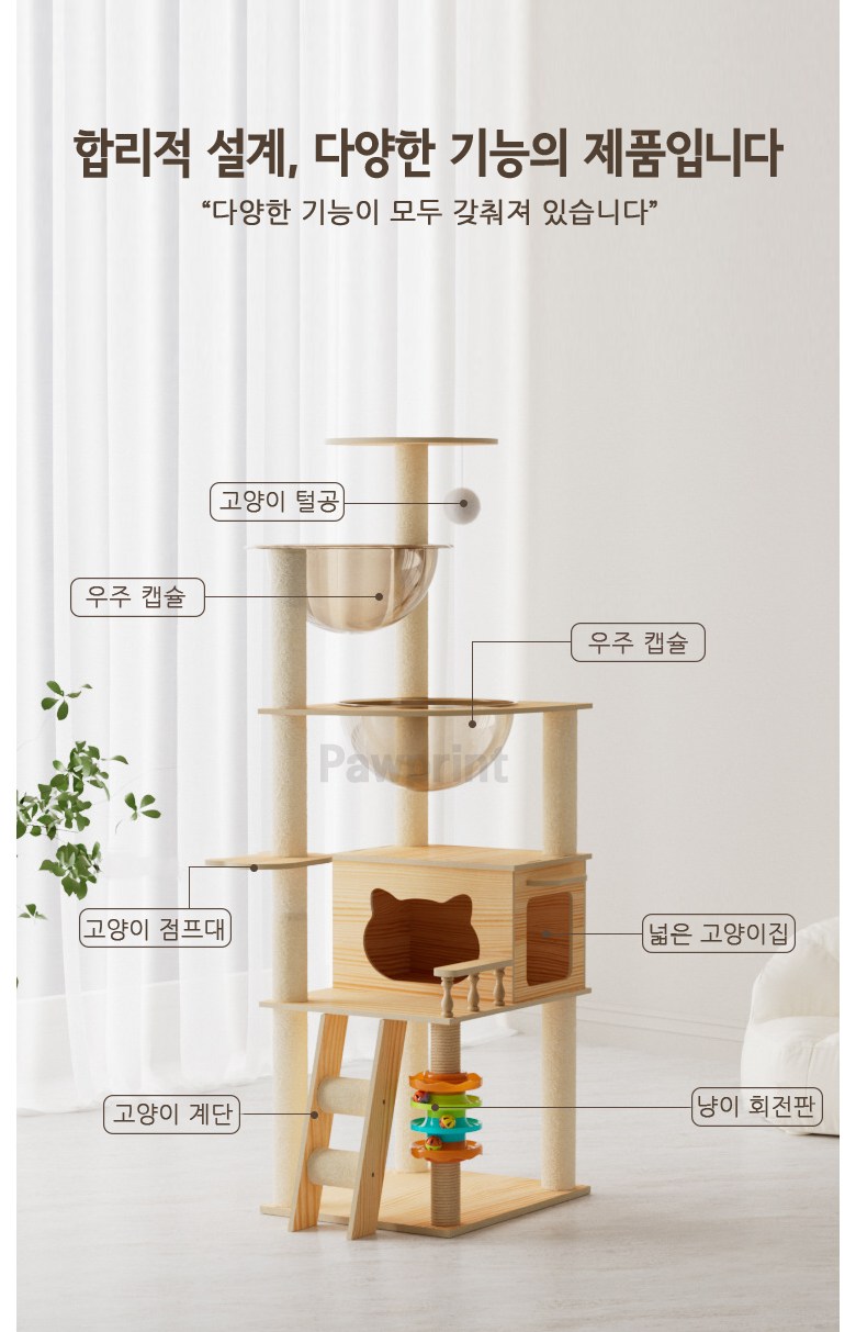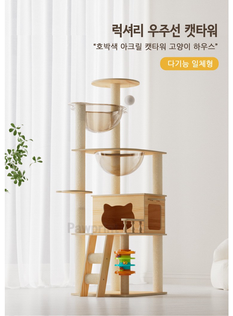 Pawprint 원목 캣타워 대형 소형 고양이 캣타워 우주선 아크릴 투명 캣하우스 다기능 고양이 놀이 공간 다묘가정 초보집사 먼치킨 성인묘 거실 원룸 실내용 다양한 고양이 활동에