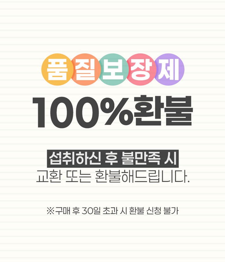 | 교환/반품 신청 기준일 | ㆍ단순변심에 의한 로켓배송 상품의 교환/반품은 제품 수령 후 30일 이내까지, 교환/반품 제한사항에 해당하지 않는 경우에만 가능 (교환/반품 비용 고객부담) ㆍ상품의 내용이 표시·광고의 내용과 다른 경우에는 상품을 수령한 날부터 3개월 이내, 그 사실을 안 날 또는 알 수 있었던 날부터 |
