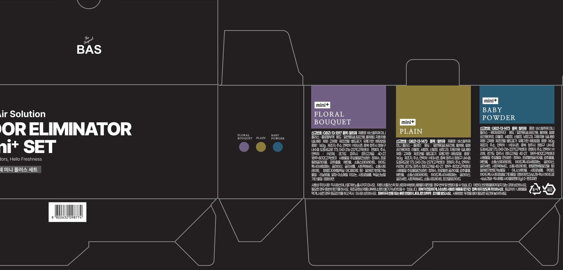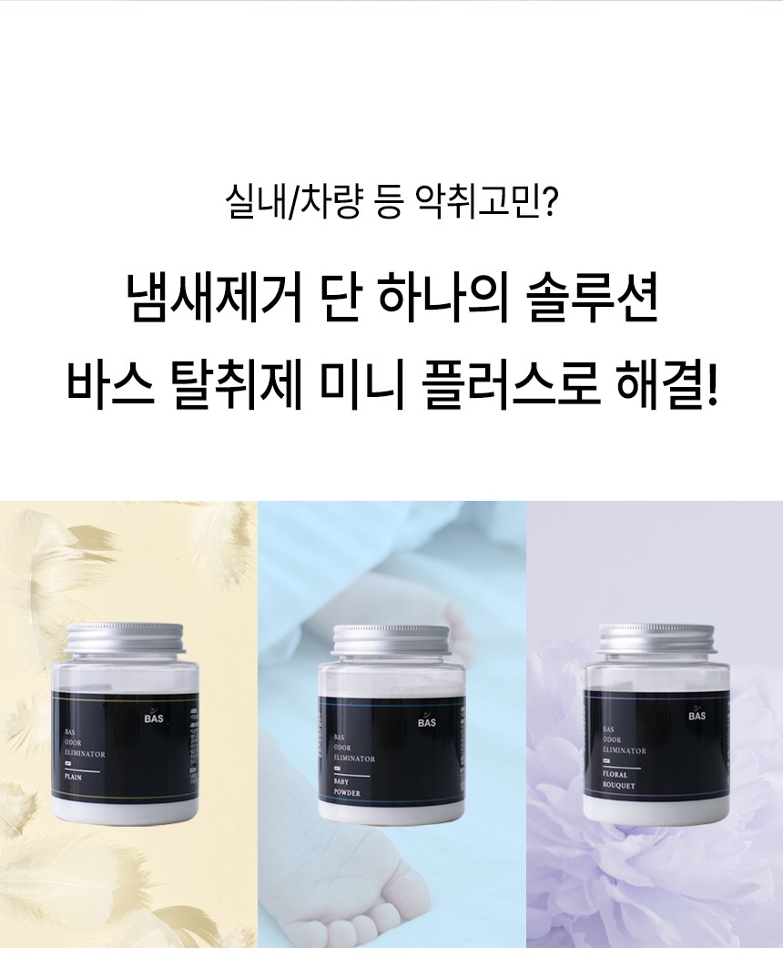 | 품목 및 제품명 | 플로랄부케: 탈취제(바스 탈취제 미니플러스 플로랄부케) / 플레인: 탈취제(바스 탈취제 미니플러스 플레인) / 베이비파우더: 탈취제(바스 탈취제 미니 플러스 - 베이비파우더) | 용도(표백제의 경우 계열을 함께표시) 및 제형 | 플로랄부케: 자동차용-실내용,일반용-실내공간용,일반용-물체용,일반용-밀폐공간용-옷장,이불장,서랍장,신발장,냉장고(비분사형-고체형) / 플레인: 자동차용-실내용,일반용-실내공간용,일반용-물체용,일반용-밀폐공간용-옷장,이불장,서랍장,신발장,냉장고(비분사형-고체형) 베이비파우더: 자동차용-실내용,일반용-실내공간용,일반용-물체용,일반용-밀폐공간용-옷장,이불장,서랍장,신발장,냉장고(비분사형-고체형) |