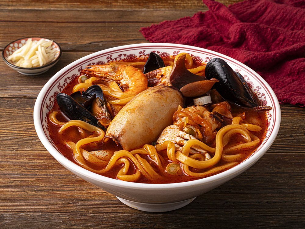 6. 홍합과 오징어를 넣은 뒤 면을 넣어 완성해주세요.