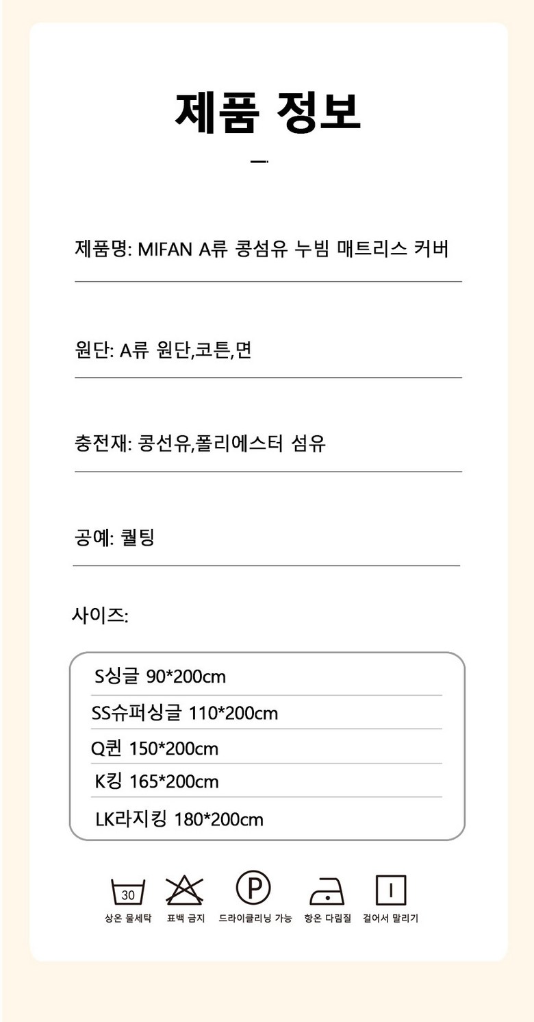 | 치수 | 90x200cm,110x200cm,150x200cm,165x200cm,180x200cm | 제품구성 | 침대커버 |