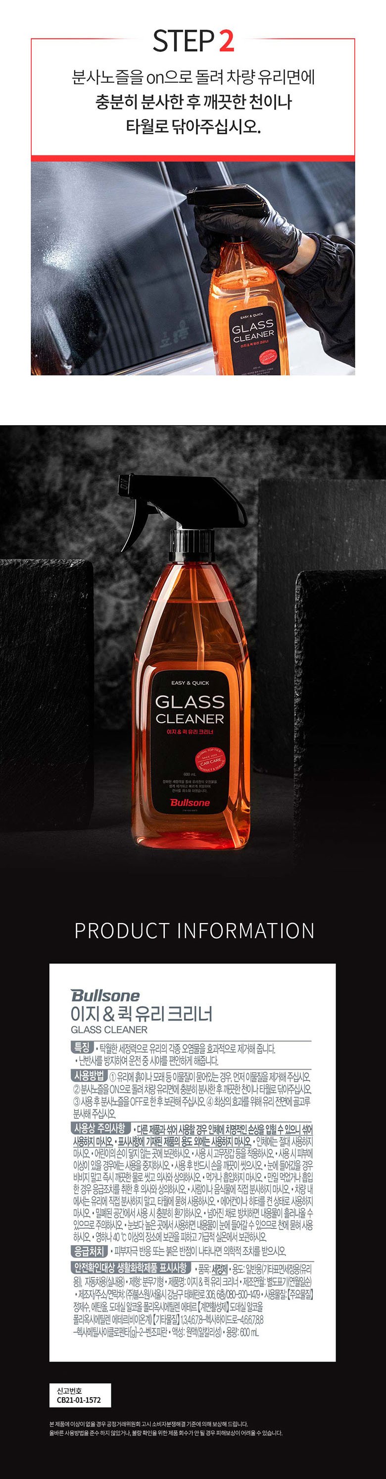 | 품목 및 제품명 | 세정제/ 이지&퀵 유리 크리너 | 용도(표백제의 경우 계열을 함께표시) 및 제형 | 일반용(기타표면세정용(유리 용)), 자동차용(실내용)/분무기형 |