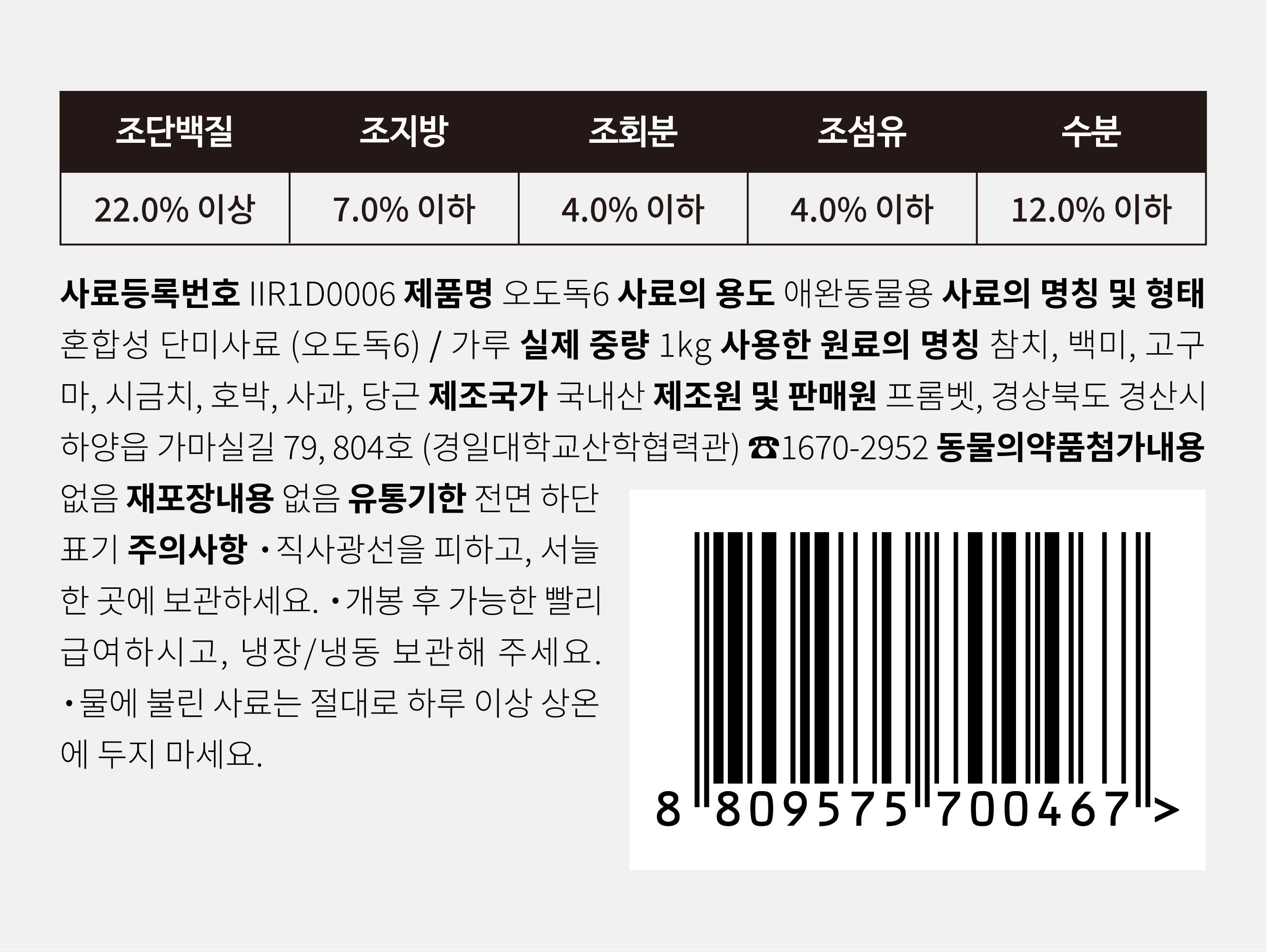 | 품명 및 모델명 | 오도독6 | 인증/허가 사항 | 사료관리법에 따른 성분등록번호 : 컨텐츠 참조 |