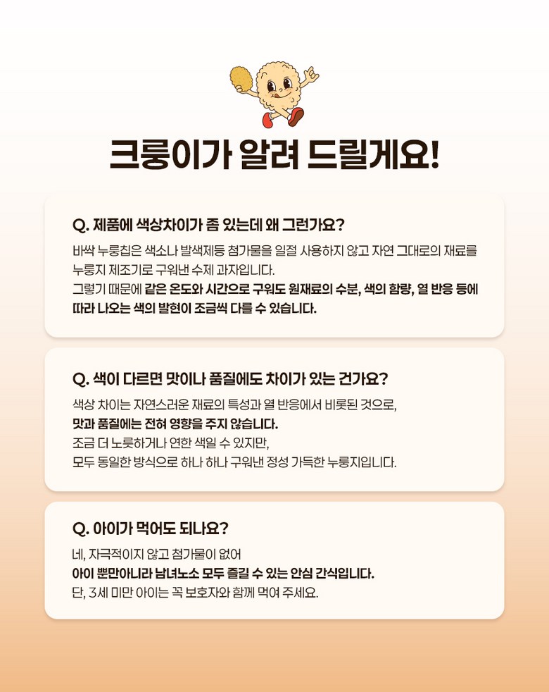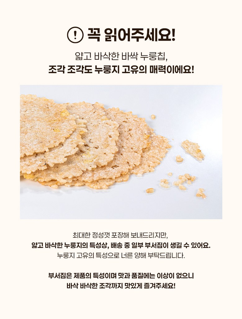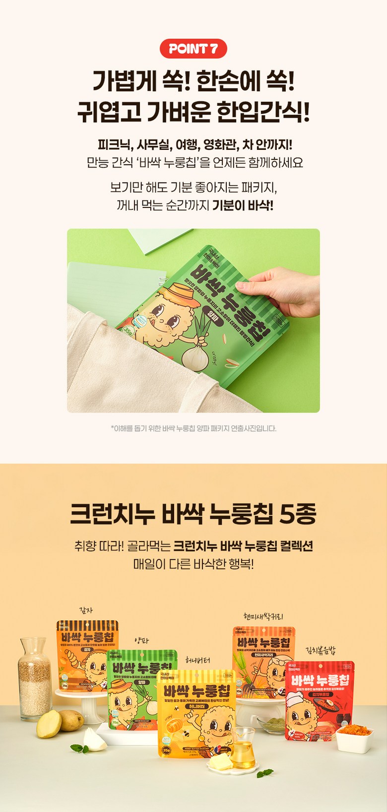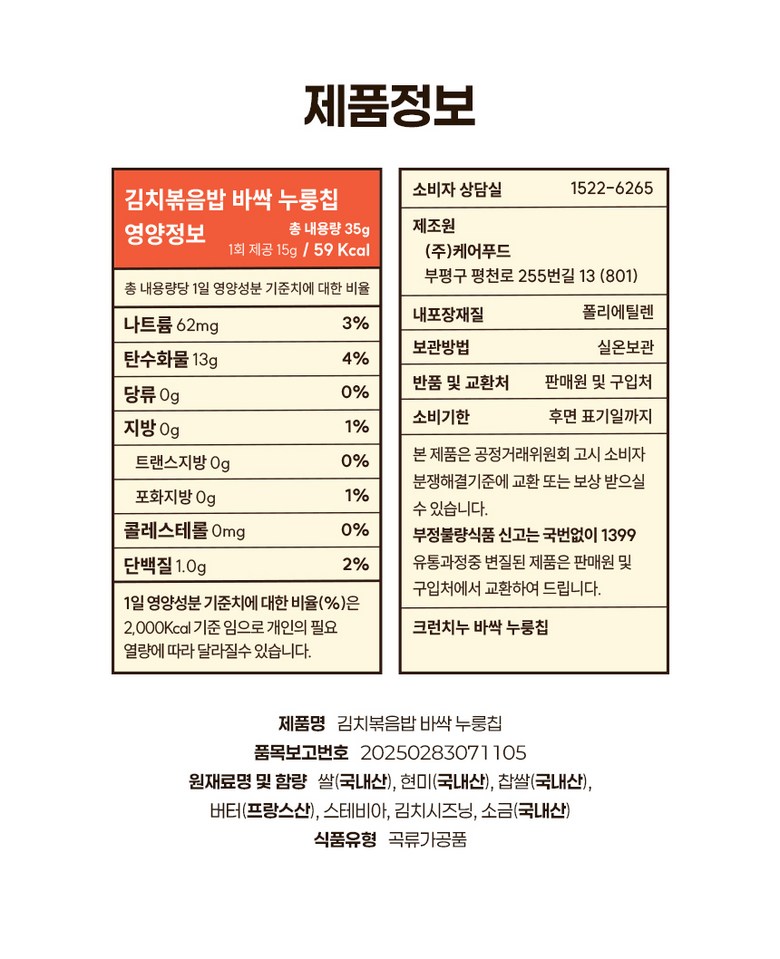 | 품목 또는 명칭 | 크런치누 감자 바싹 누룽칩 | 포장단위별 내용물의 용량(중량),수량,크기 | 35g |