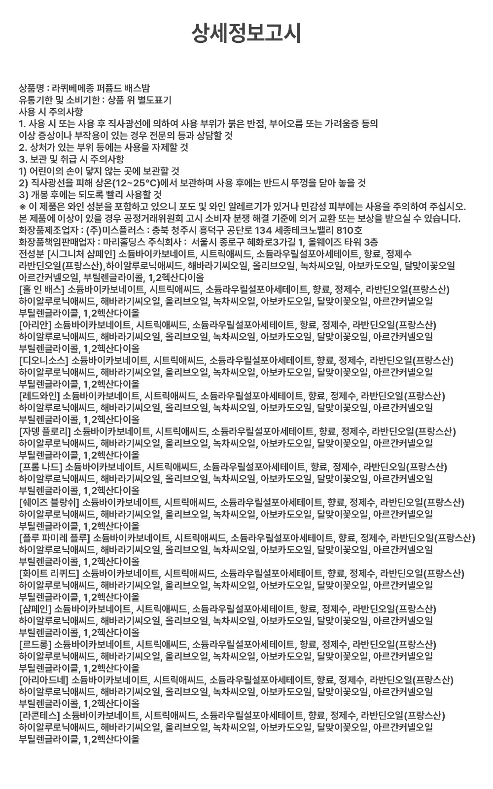 | 화장품제조업자, 화장품책임판매업자 및 맞춤형화장품판매업자 | 컨텐츠 참조 | 제조국 | 대한민국 |