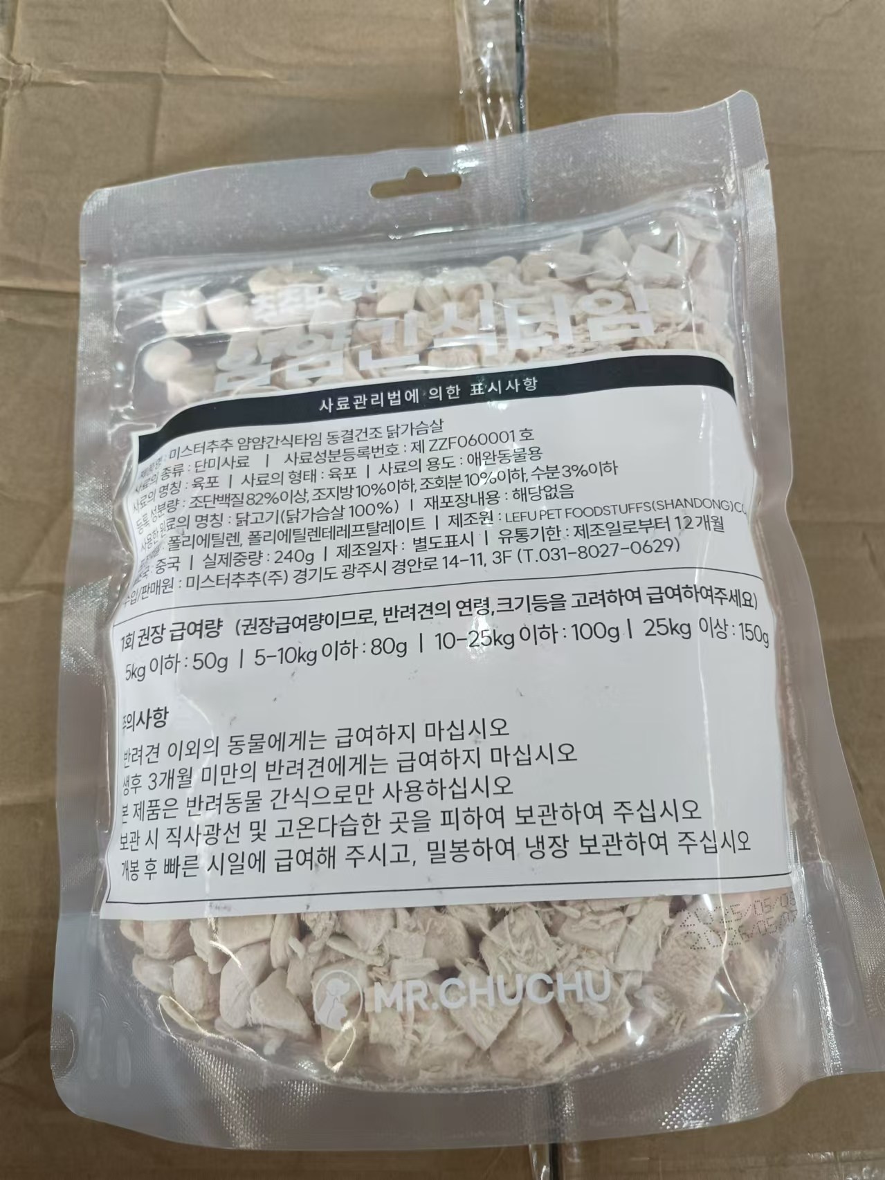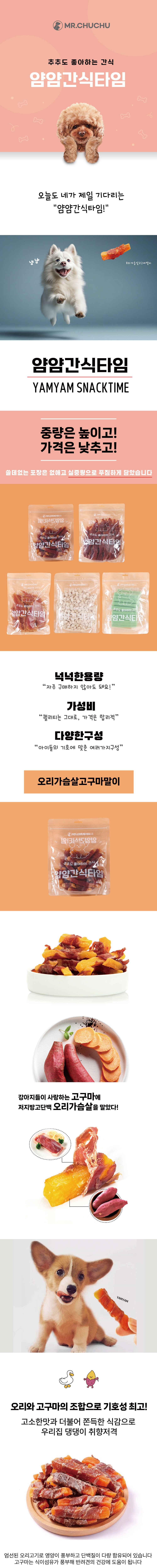 | 품명 및 모델명 | 미스터추추 얌얌간식타임 반려동물간식 동결건조 닭가슴살 | 인증/허가 사항 | 사료관리법에 따른 성분등록번호 : 컨텐츠 참조 |