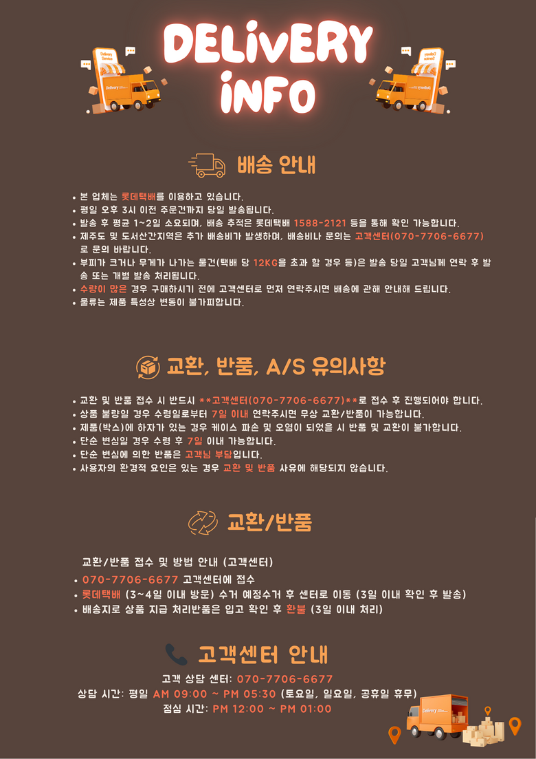 - ㆍ모니터 해상도의 차이로 인해 색상이나 이미지가 실제와 달라, 고객이 단순 변심으로 교환/반품을 무료로 요청하는 경우