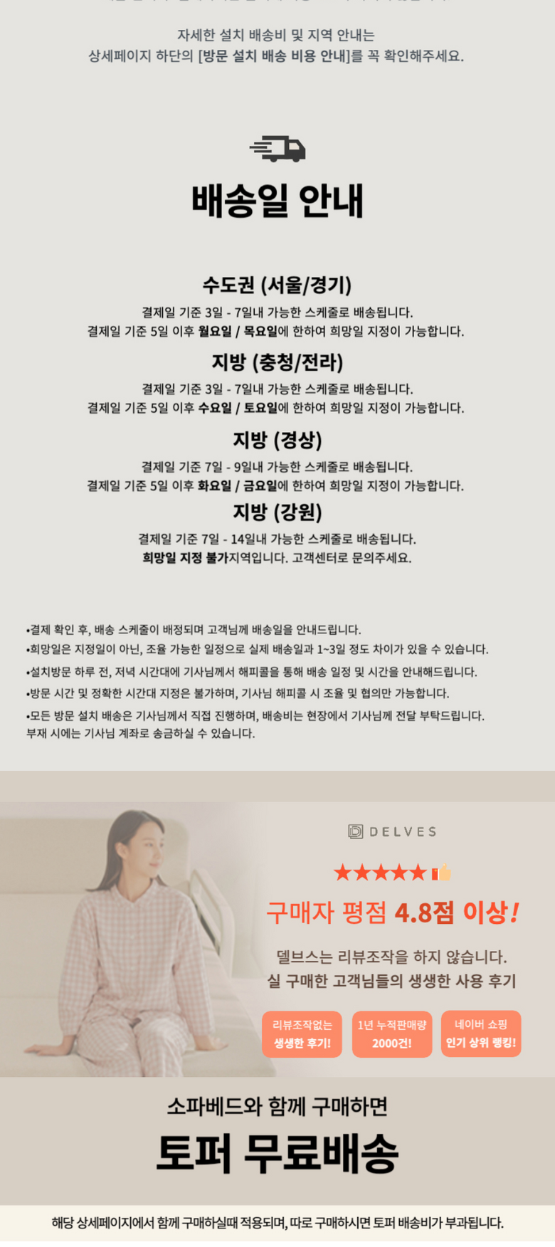 | 배송기간 | ㆍ도서산간 지역 등은 배송에 3-5일이 더 소요될 수 있습니다. - 천재지변, 물량 수급 변동 등 예외적인 사유 발생 시, 다소 지연될 수 있는 점 양해 부탁드립니다. | ||