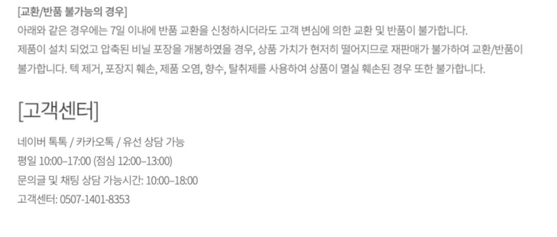 | 교환/반품 신청 기준일 | ㆍ단순변심에 의한 교환/반품은 제품 수령 후 7일 이내까지, 교환/반품 제한사항에 해당하지 않는 경우에만 가능 (배송비용과 교환/반품 비용 왕복배송비 고객부담) ㆍ상품의 내용이 표시·광고의 내용과 다른 경우에는 상품을 수령한 날부터 3개월 이내, 그 사실을 안 날 또는 알 수 있었던 날부터 |