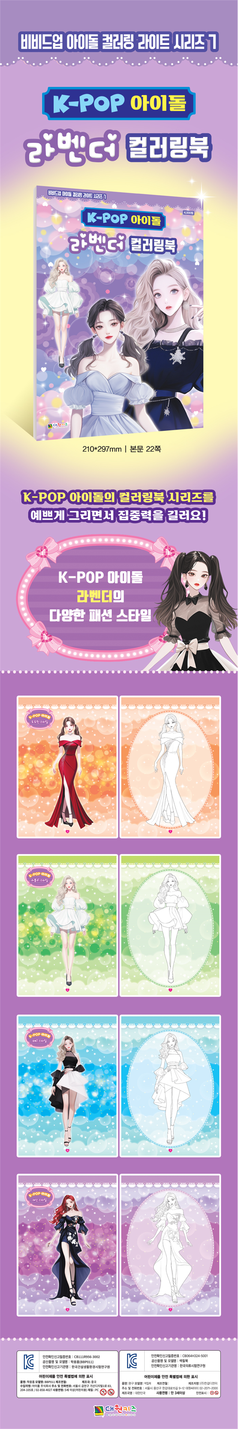 | 품명 및 모델명 | K-POP 아이돌 라벤더 컬러링북 | KC 인증정보 | CB111R956-3002, CB064H324-5001 |