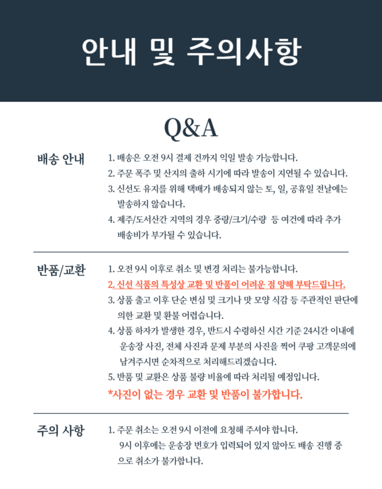 - ㆍ교환/반품에 관한 일반적인 사항은 판매자가 제시사항보다 관계법령이 우선합니다.