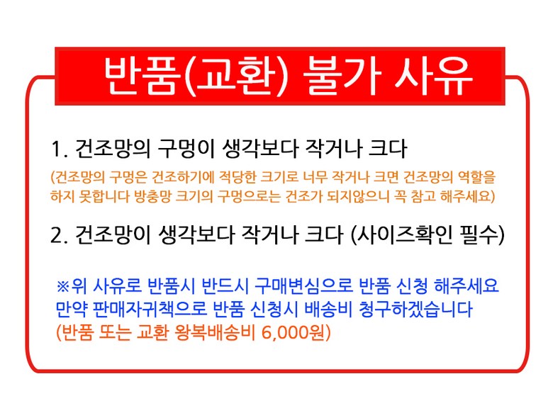 - ㆍ교환/반품에 관한 일반적인 사항은 판매자가 제시사항보다 관계법령이 우선합니다.