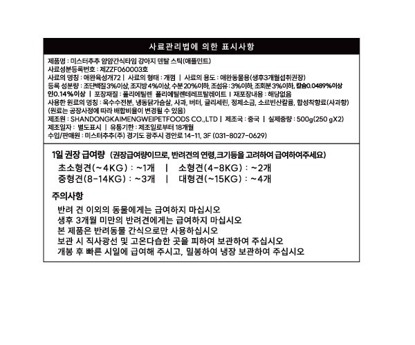 | 품명 및 모델명 | 미스터추추 얌얌간식타임 강아지 덴탈 스틱(애플민트) | 인증/허가 사항 | 사료관리법에 따른 성분등록번호 : 컨텐츠 참조 |