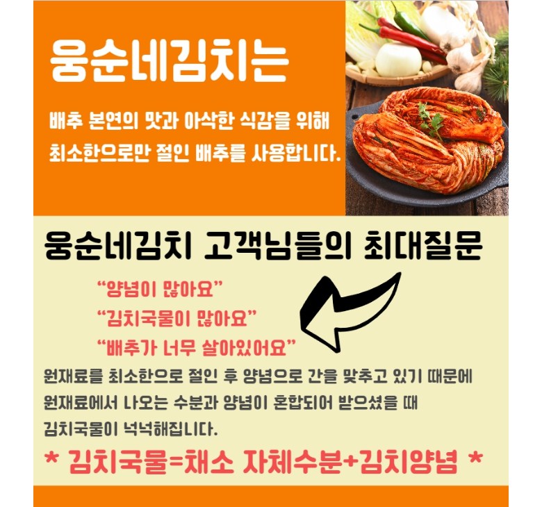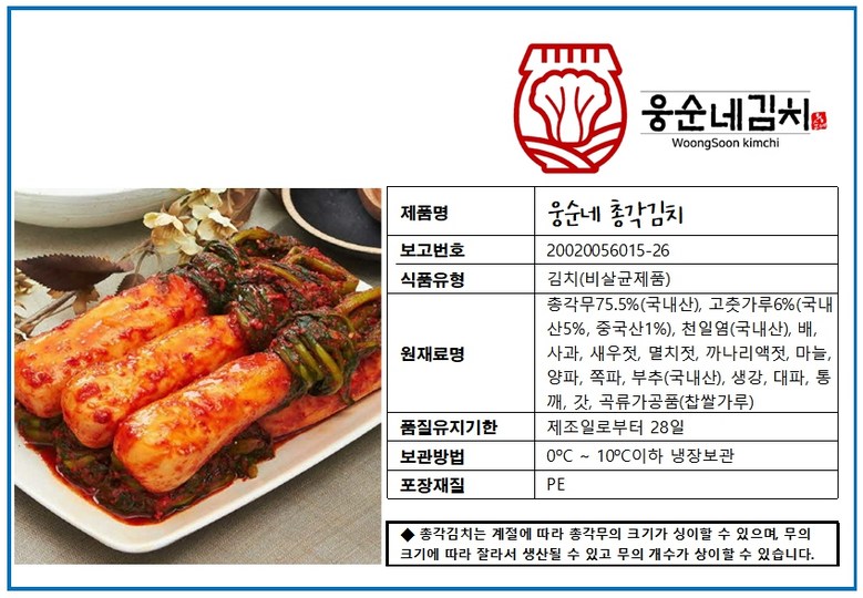 | 생산자 및 소재지 | 웅순네김치/서울 도봉구 | 제조연월일, 소비기한 또는 품질유지기한 | 상세페이지참조 |