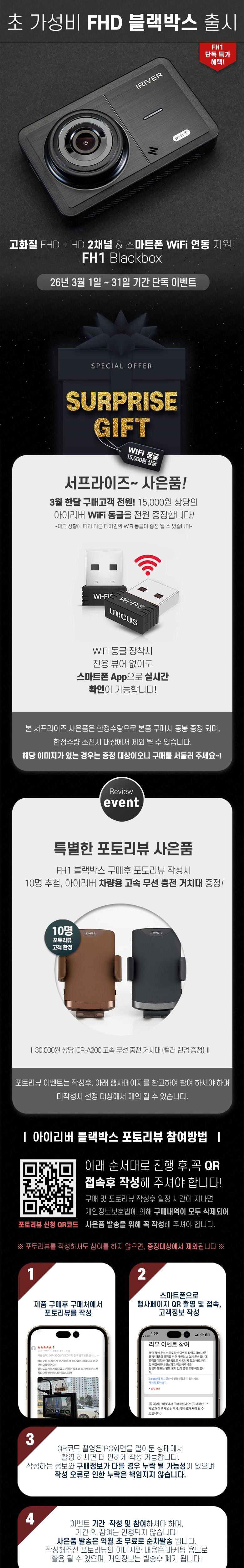 | 품명 및 모델명 | 아이리버 2채널 FHD+HD 블랙박스 FH1 | 동일모델 출시년월 | 2024년 4월 |