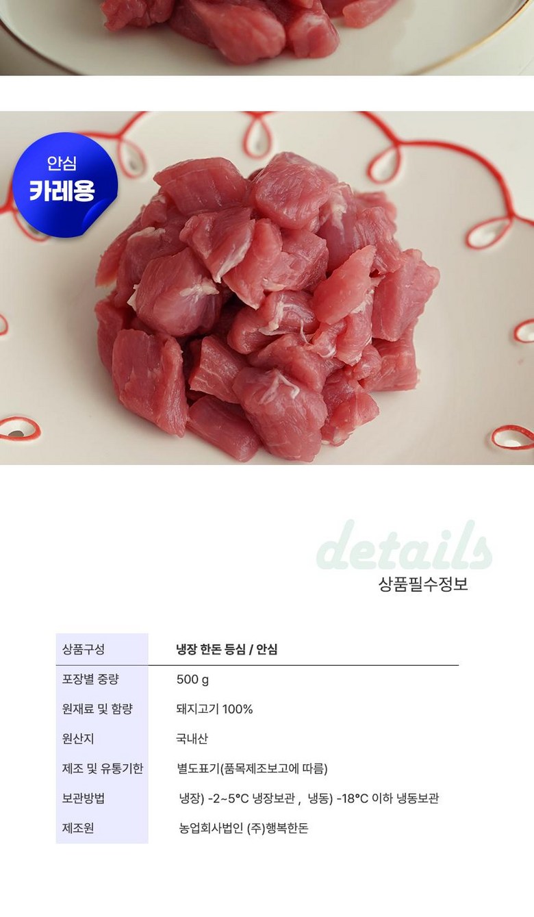 | 품목 또는 명칭 | 한돈 안심 등심 냉장 | 포장단위별 내용물의 용량(중량),수량,크기 | 500g |