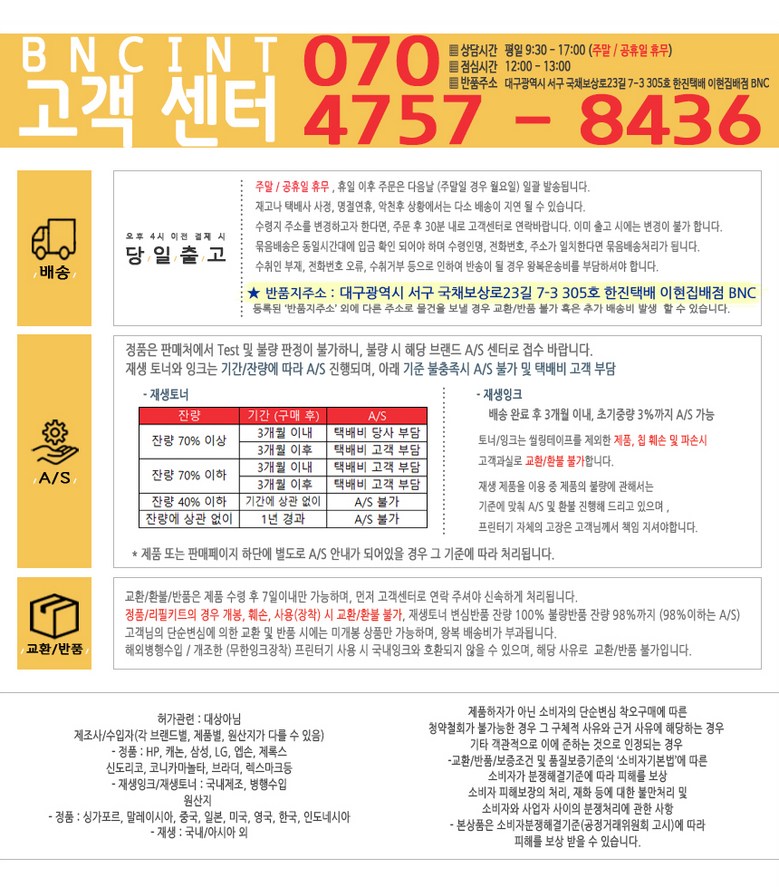 - ㆍ교환/반품에 관한 일반적인 사항은 판매자가 제시사항보다 관계법령이 우선합니다.