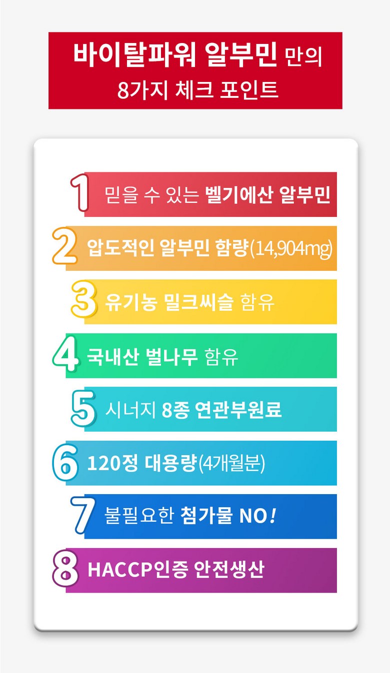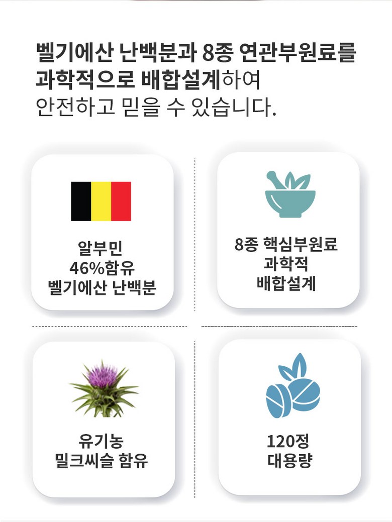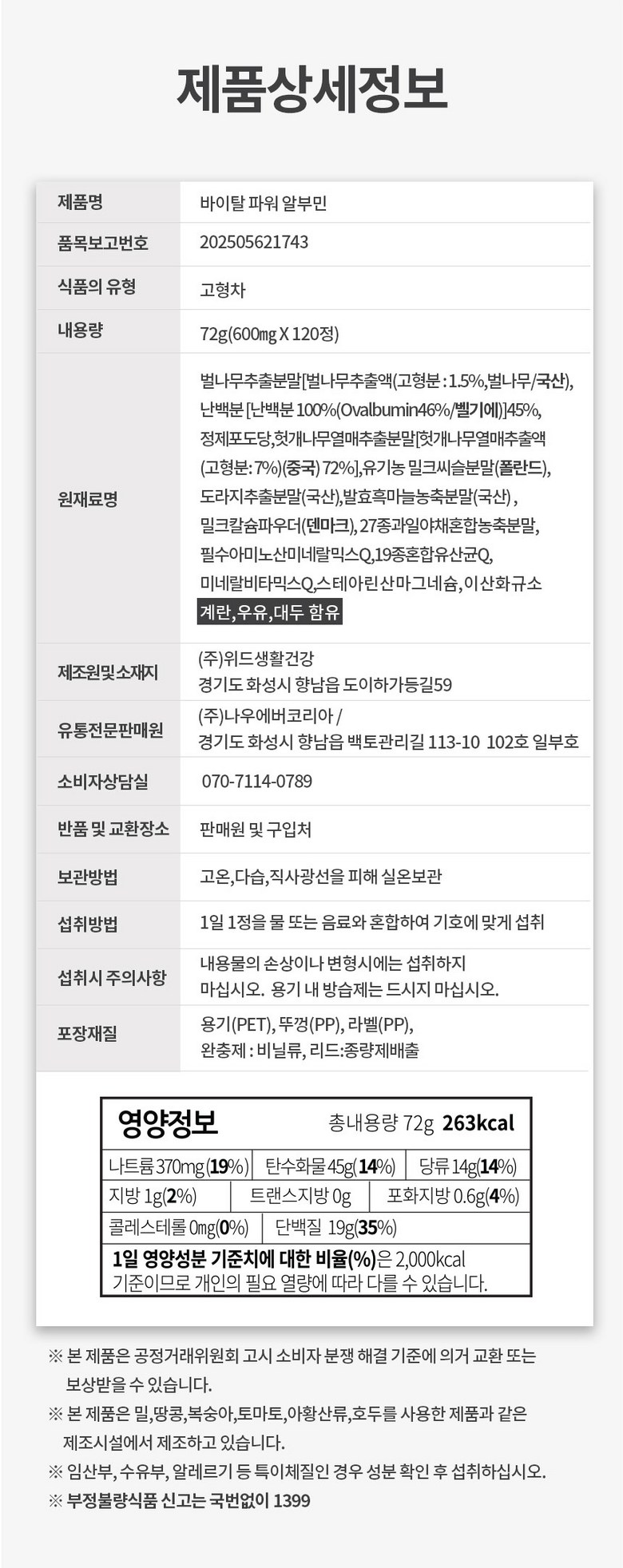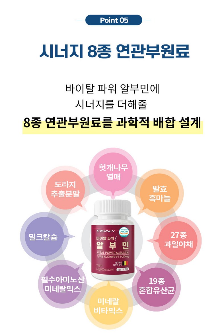 | 원재료명 및 함량 | 벌나무추출분말[벌나무추출액(고형분 : 1.5%,벌나무/국산),난백분 수퍼하이겔 [난백분 100%(Ovalbumin46%/벨기에)]45%정제포도당,헛개나무열매추출분말[헛개나무열매추출액(고형분: 7%)(중국) 72%],유기농 밀크씨슬분말(폴란드),도라지추출분말(국산),발효흑마늘농축분말(국산) ,밀크칼슘파우더(덴마크), 27종과일야채혼합농축분말, 필수아미노산미네랄믹스Q,19종혼합유산균Q, 미네랄비타믹스Q,스테아린산마그네슘,이산화규소 계란,우유,대두 함유 | 영양성분 | 해당 없음 |