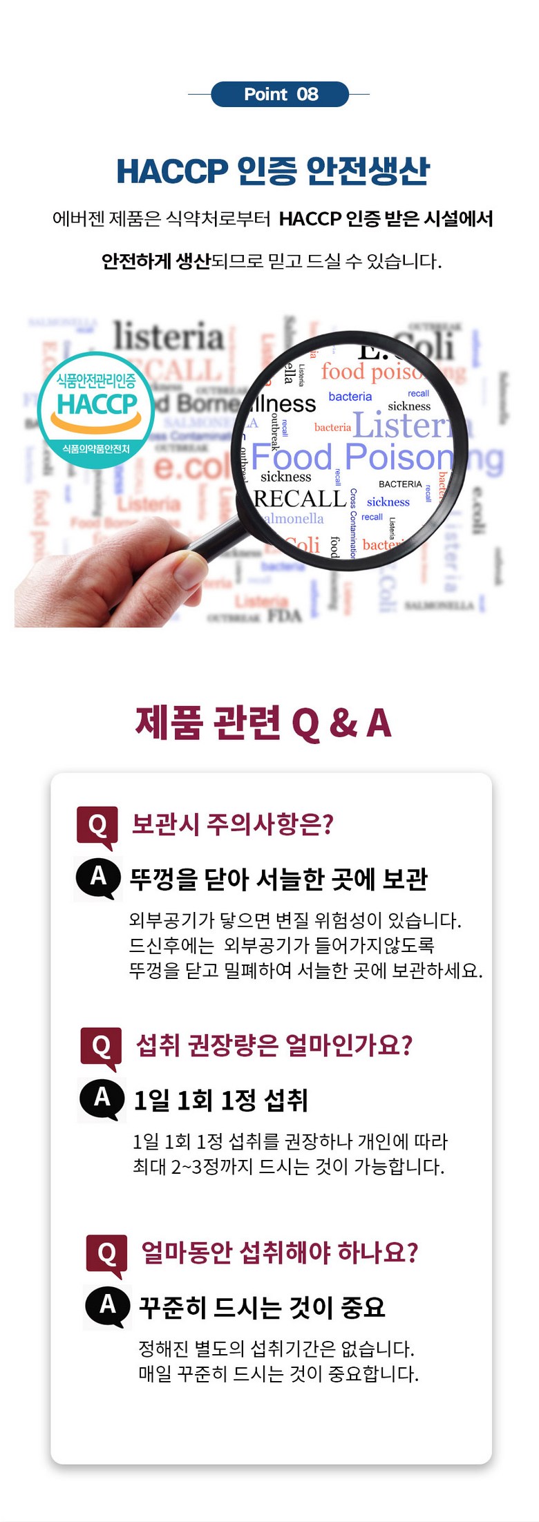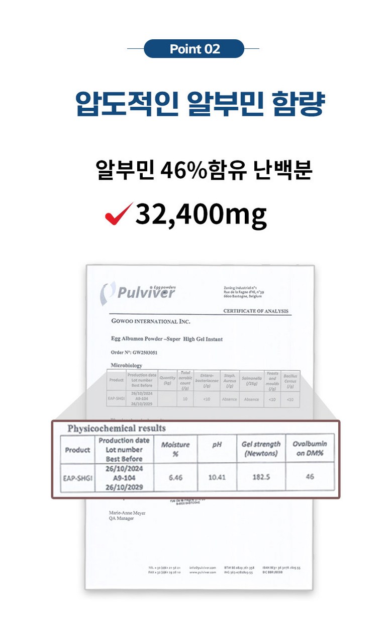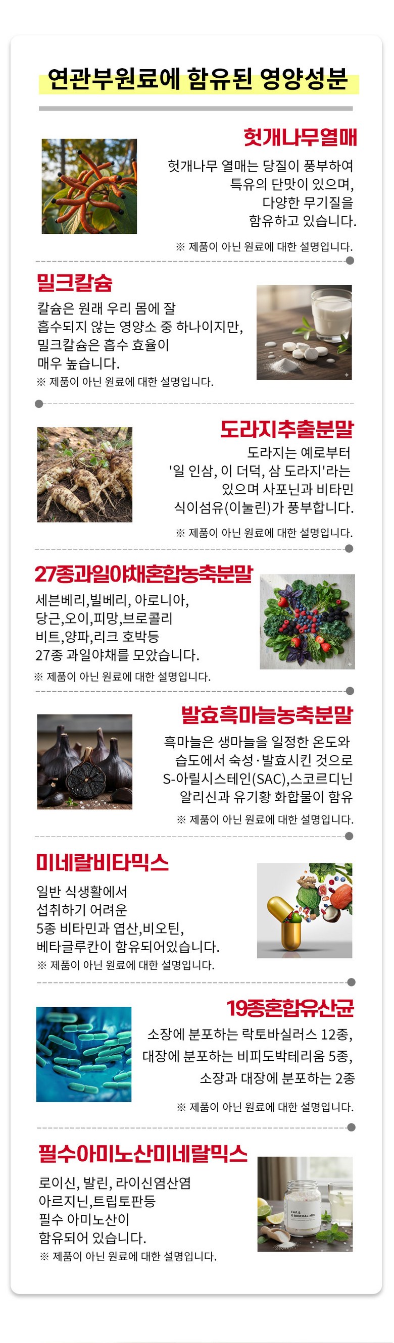 | 원재료명 및 함량 | 벌나무추출분말[벌나무추출액(고형분 : 1.5%,벌나무/국산),난백분 수퍼하이겔 [난백분 100%(Ovalbumin46%/벨기에)]45%정제포도당,헛개나무열매추출분말[헛개나무열매추출액(고형분: 7%)(중국) 72%],유기농 밀크씨슬분말(폴란드),도라지추출분말(국산),발효흑마늘농축분말(국산) ,밀크칼슘파우더(덴마크), 27종과일야채혼합농축분말, 필수아미노산미네랄믹스Q,19종혼합유산균Q, 미네랄비타믹스Q,스테아린산마그네슘,이산화규소 계란,우유,대두 함유 | 영양성분 | 해당 없음 |