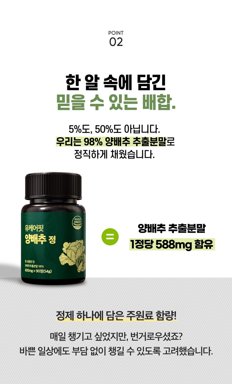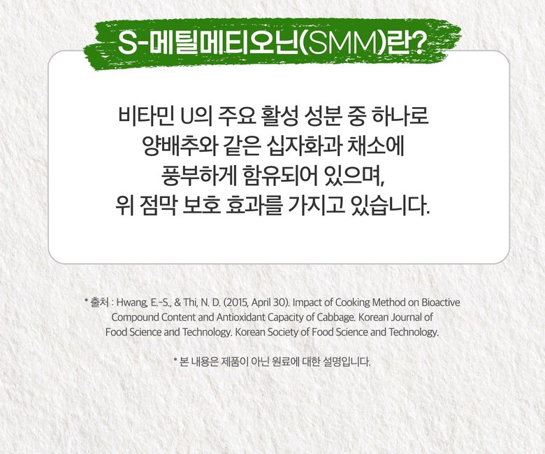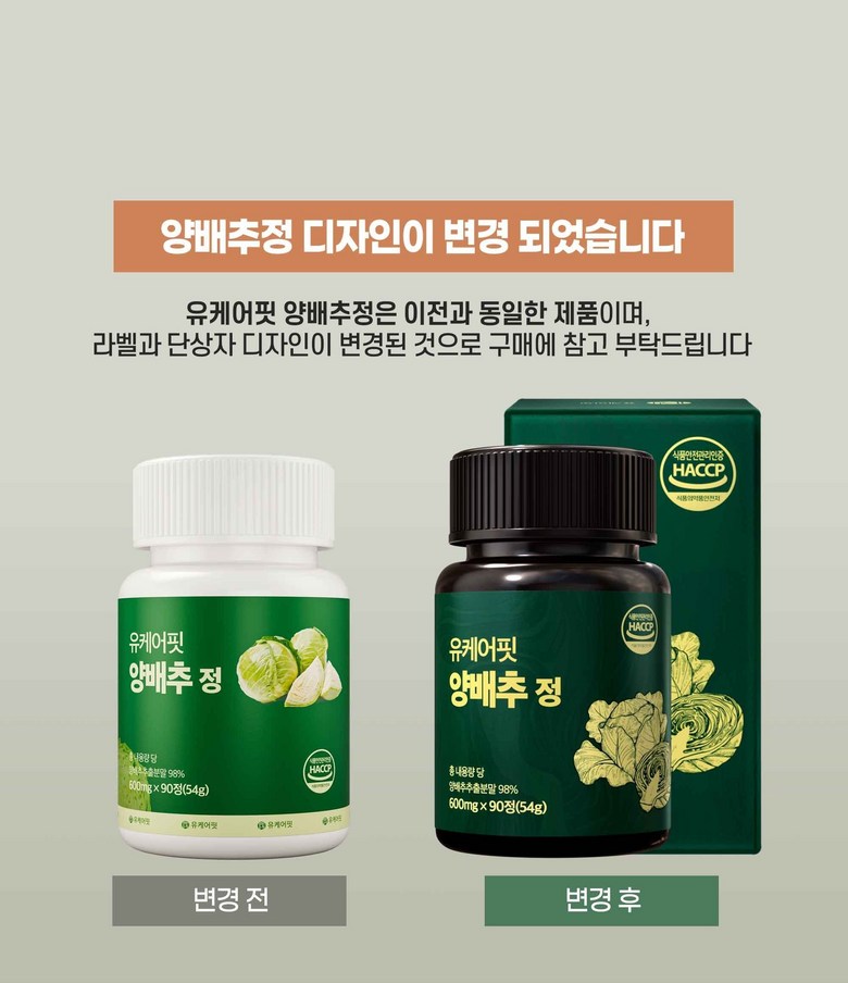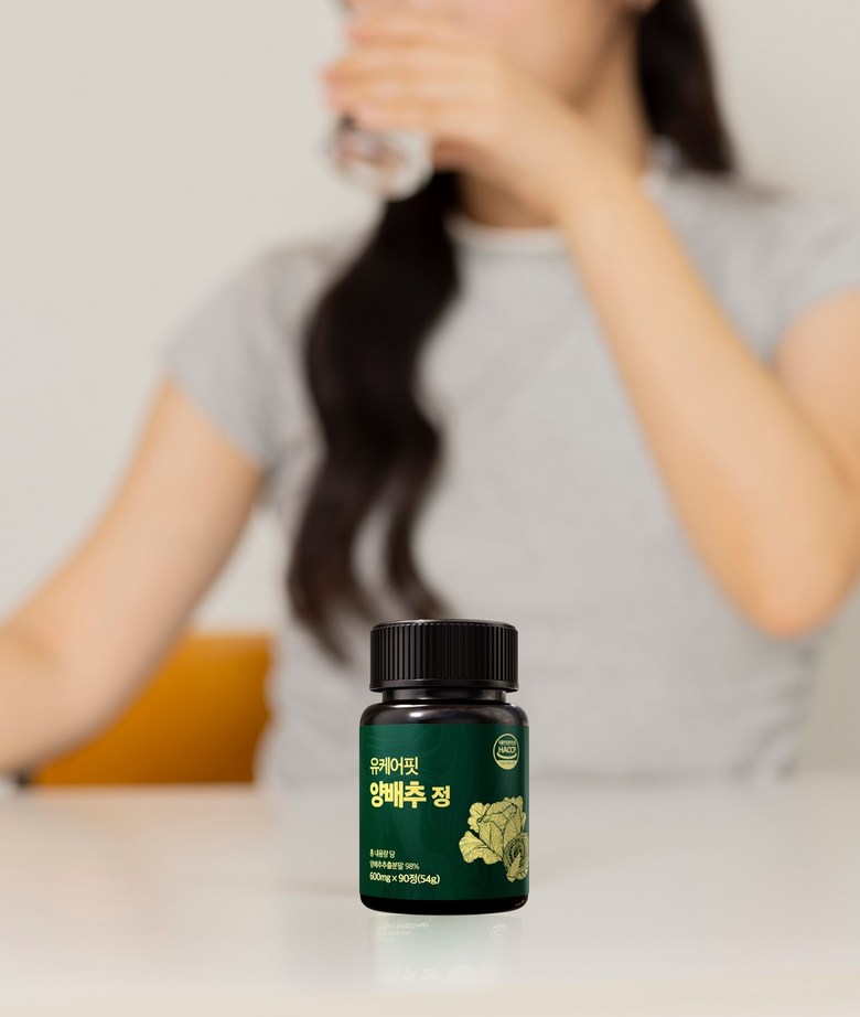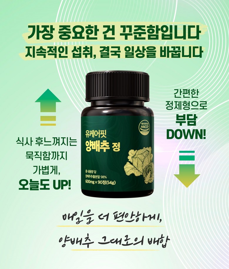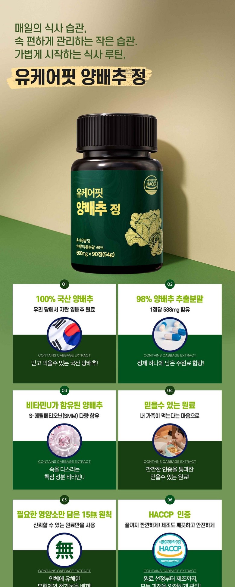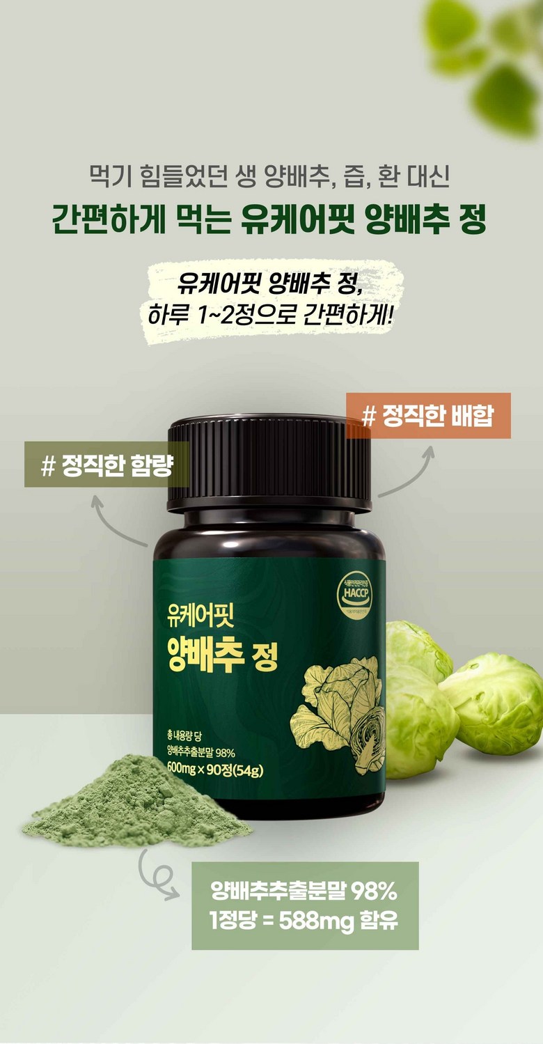 | 포장단위별 내용물의 용량(중량), 수량 | 1개 90정 / 600mg x 90정(54g) | 원재료명 및 함량 | 양배추추출분말 [양배추추출액 (정제수, 양배추(국산) 33.33%) 65%, 덱스트린] 98%,이산화규소, 스테아린산마그네슘 |