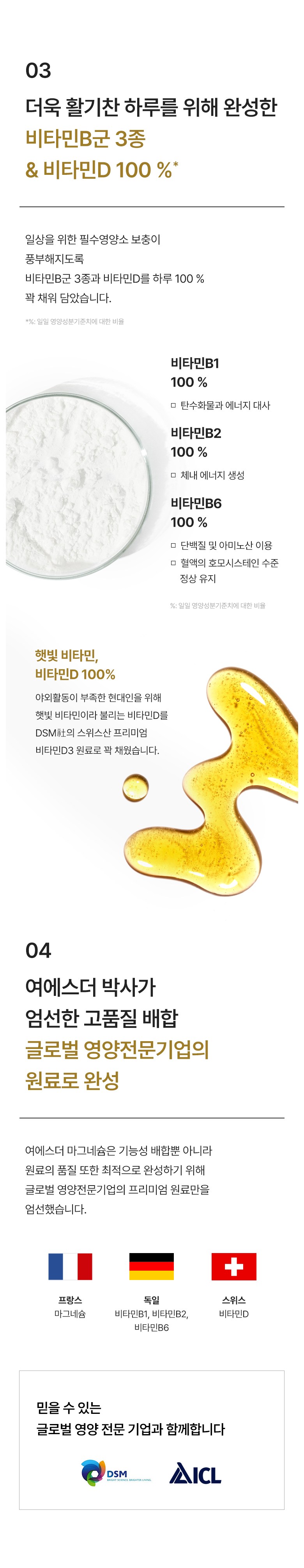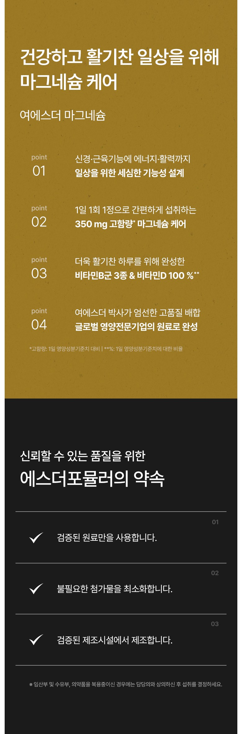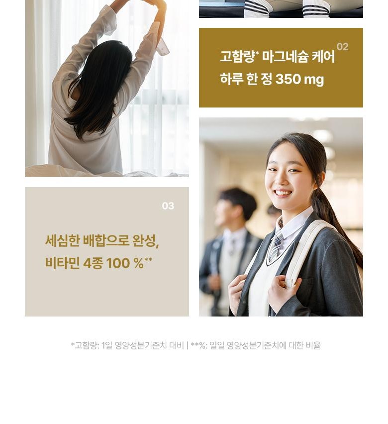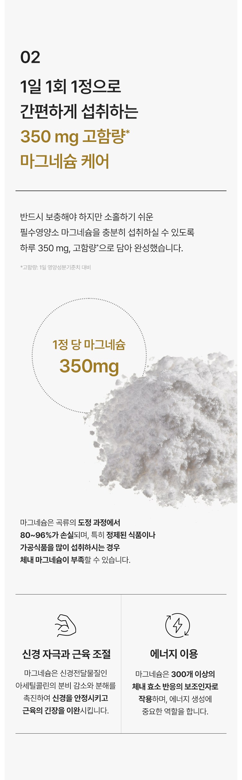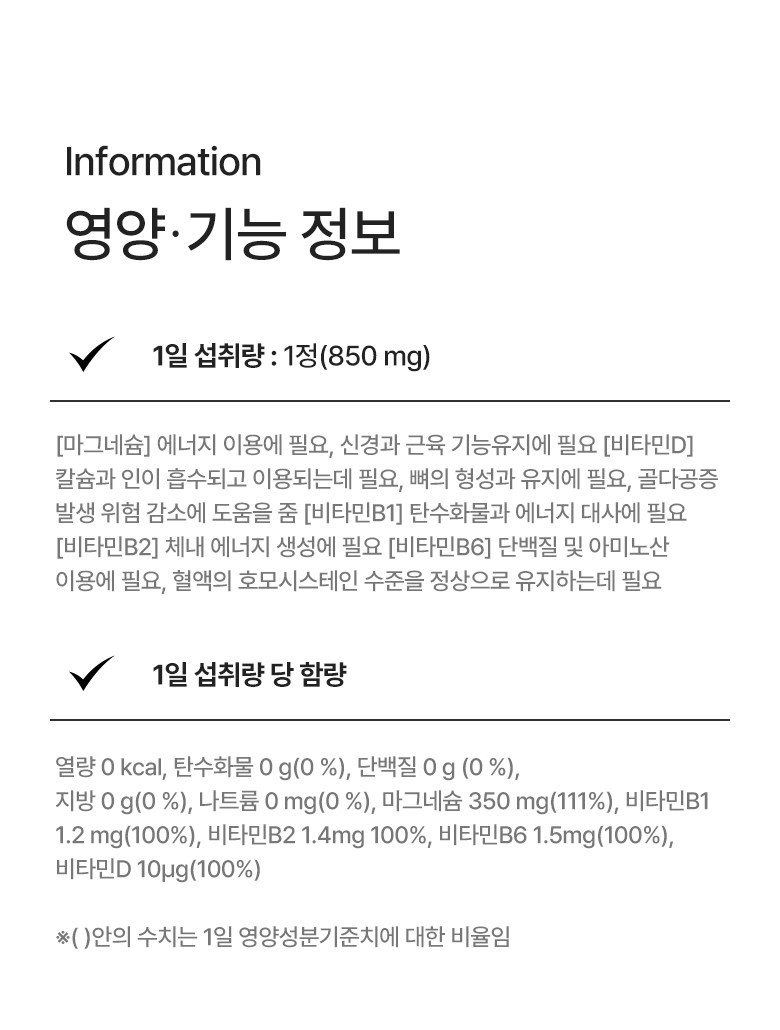 | 원료명 및 함량 | 산화마그네슘, 스테아린산마그네슘, 혼합제제(비타민D3, 아라비아검, 수크로스, 옥수수전분, 중쇄중성지방, 이산화규소, dl-α-토코페롤), 비타민B6염산염, 비타민B1질산염, 비타민B2, 말토덱스트린, 히드록시프로필메틸셀룰로스, 결정셀룰로스, 가교카복시메틸셀룰로스나트륨, 이산화티타늄(착색료), 혼합제제(글리세린지방산에스테르, 프로필렌글리콜, 구연산), 카라멜색소IV | 영양정보 | 상품 상세페이지 참조 |