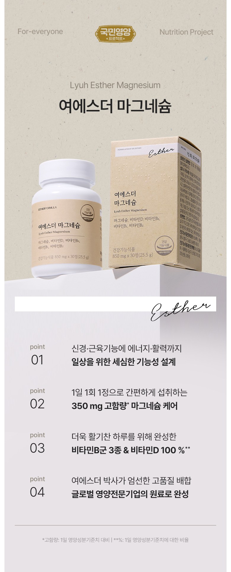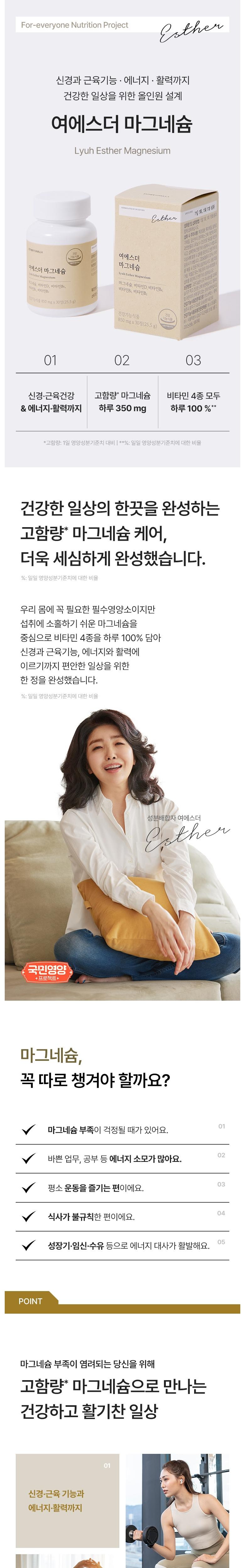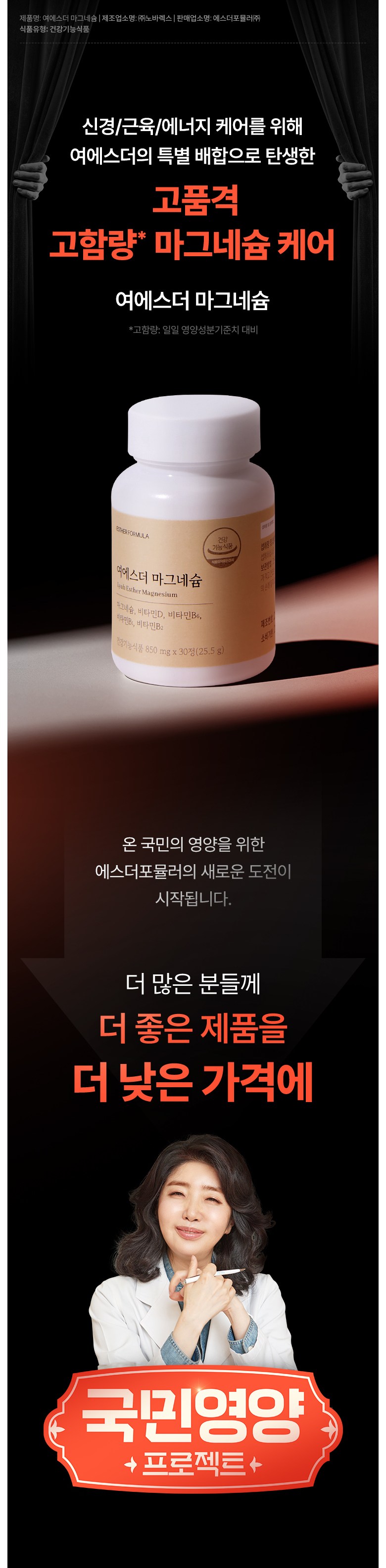 | 제품명 | 여에스더 마그네슘 | 제조업소의 명칭과 소재지 | ㈜노바렉스 / 충북 청주시 흥덕구 오송읍 오송생명14로 80 |