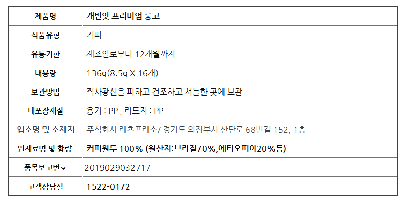 | 포장단위별 내용물의 용량(중량), 수량 | 136g, 1개 | 원재료명 및 함량 | 컨텐츠 참조 |