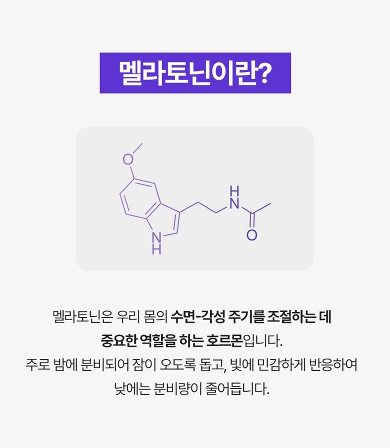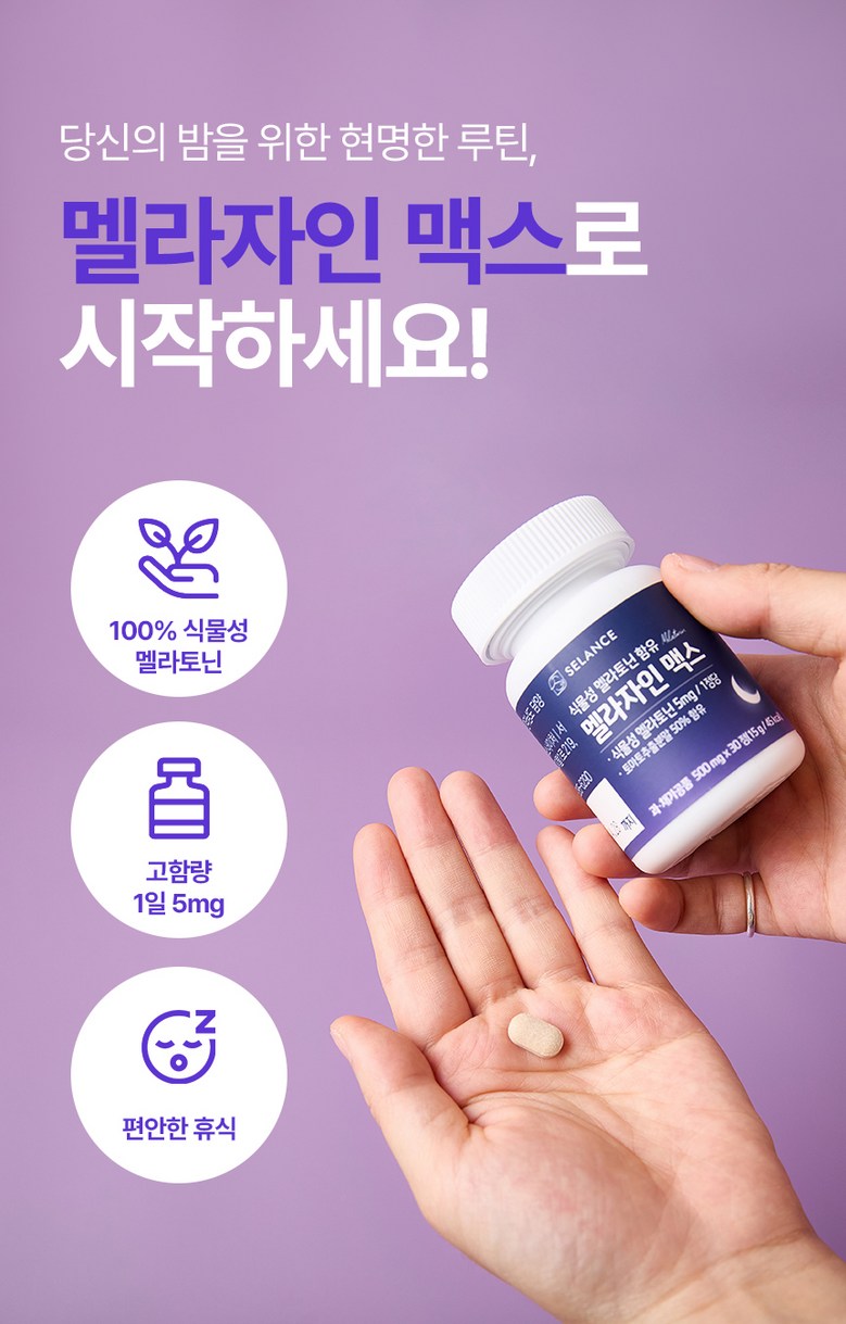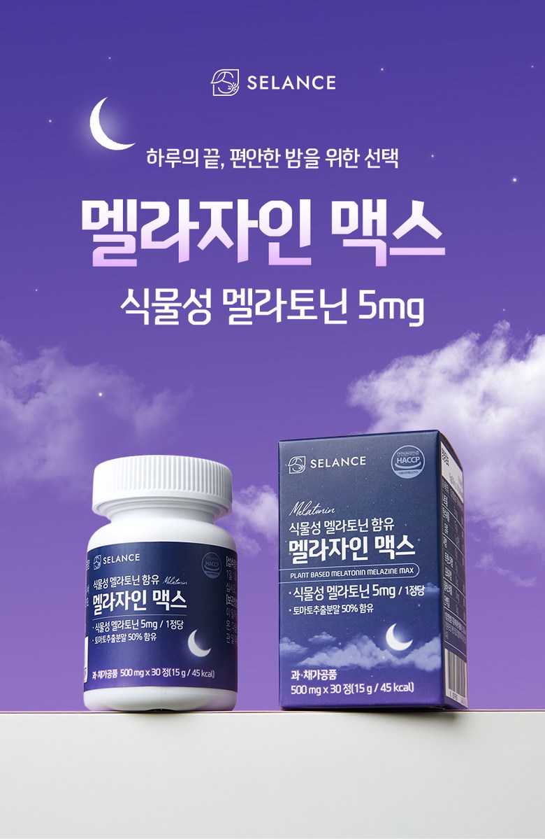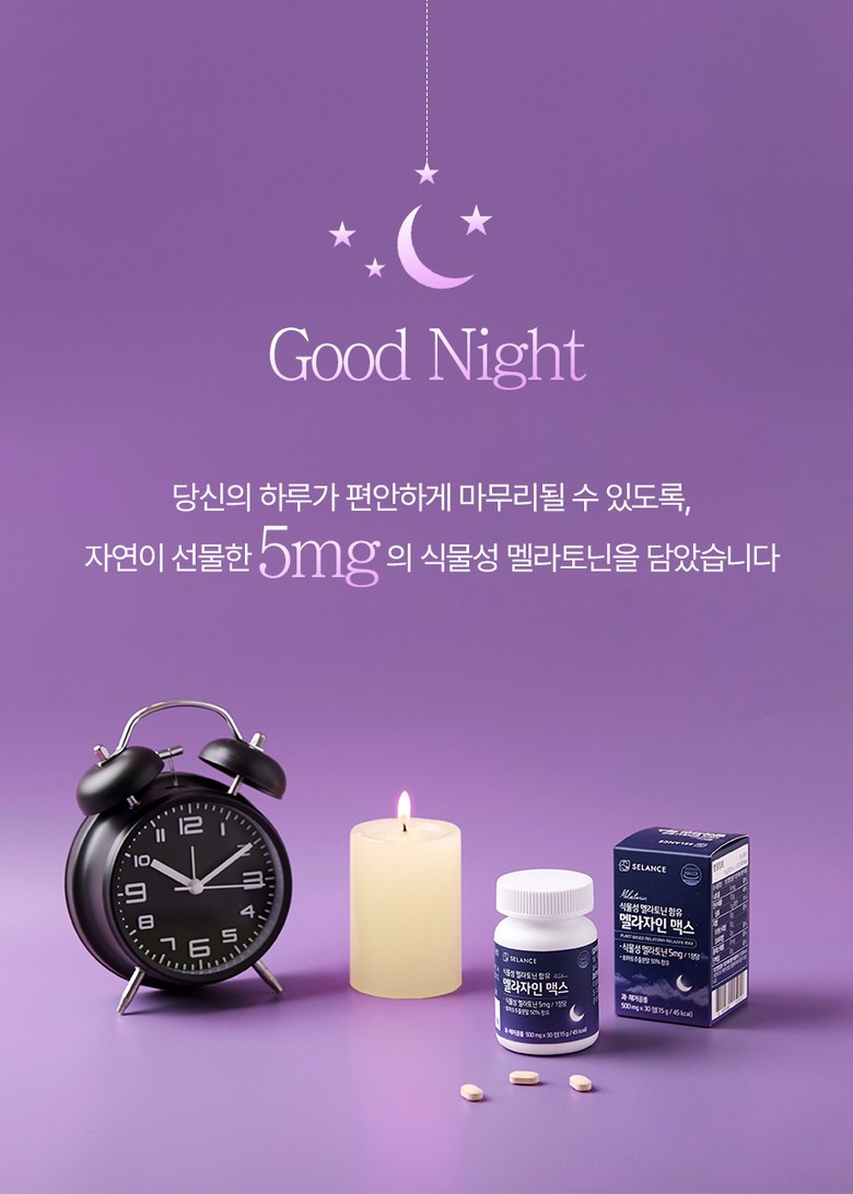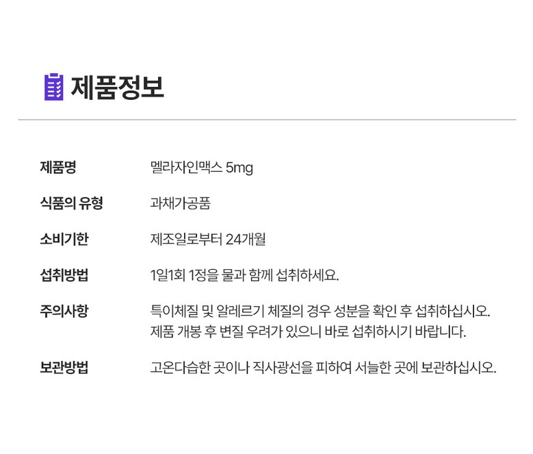 | 원재료명 및 함량 | 식물성 멜라토닌(5mg), 산화마그네슘, 테아닌, 유청칼슘, 비타민D3, 타트체리농축분말, 감태추출분말, 미강추출분말, 레몬밤잎추출분말, 결정셀룰로스, 스테아린산마그네슘 등 | 영양성분 | 1정(500mg)당 열량 0kcal, 탄수화물 13g, 단백질 0g, 지방 0g, 나트륨 5mg, 멜라토닌 5mg |