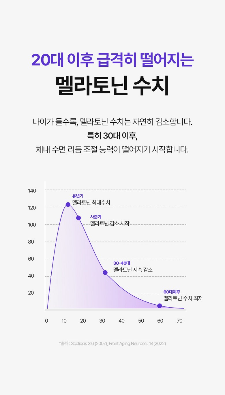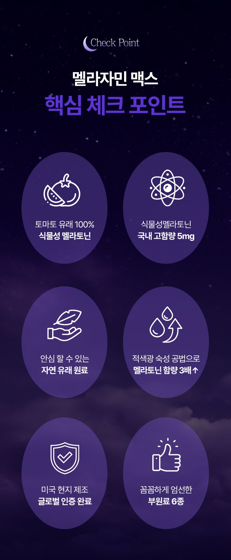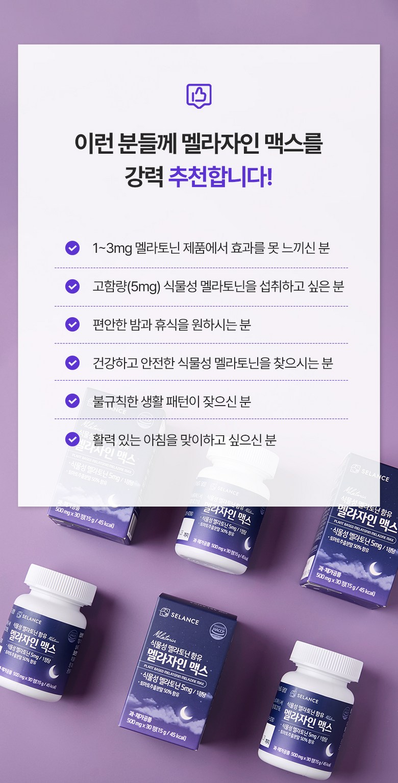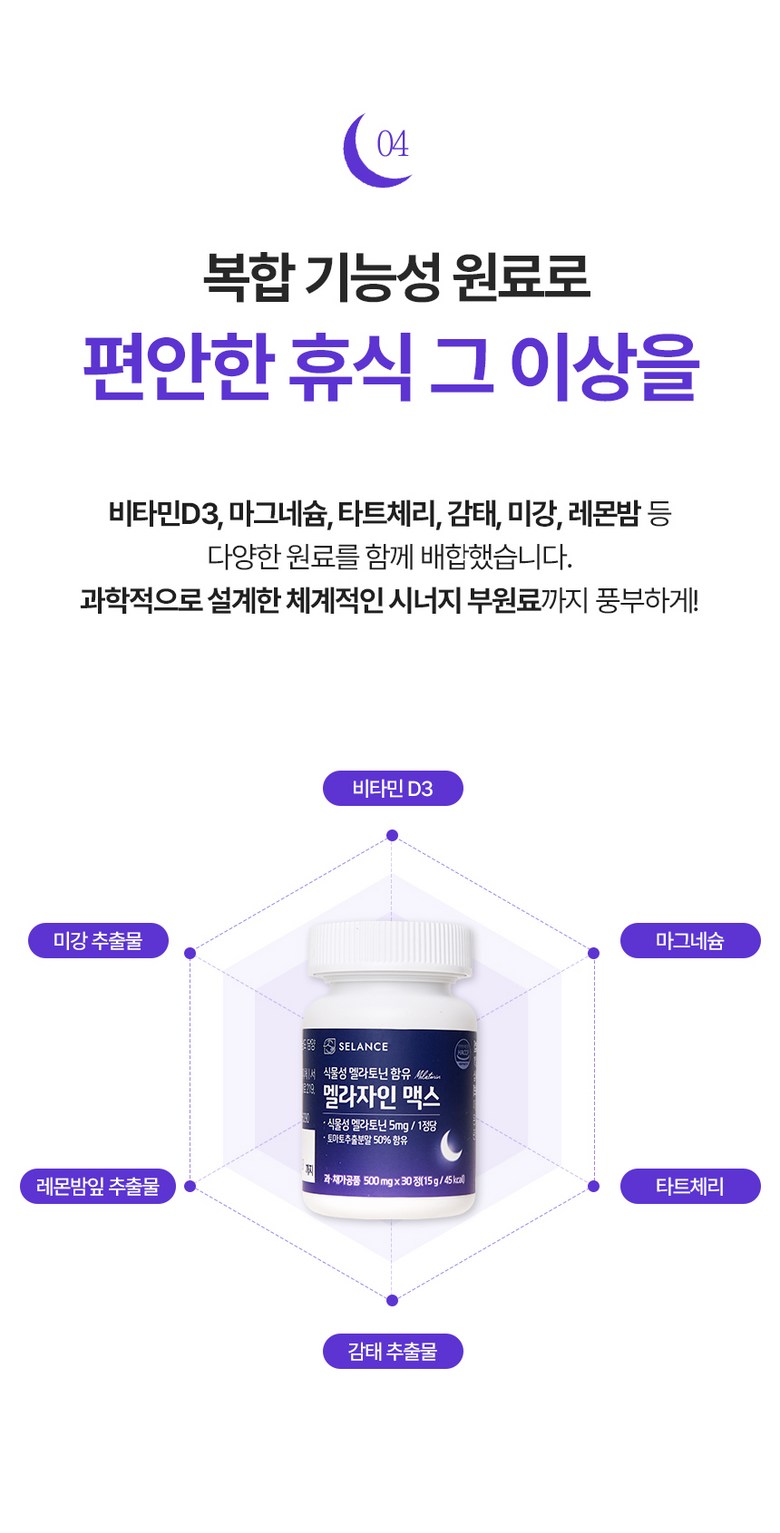 | 원재료명 및 함량 | 식물성 멜라토닌(5mg), 산화마그네슘, 테아닌, 유청칼슘, 비타민D3, 타트체리농축분말, 감태추출분말, 미강추출분말, 레몬밤잎추출분말, 결정셀룰로스, 스테아린산마그네슘 등 | 영양성분 | 1정(500mg)당 열량 0kcal, 탄수화물 13g, 단백질 0g, 지방 0g, 나트륨 5mg, 멜라토닌 5mg |