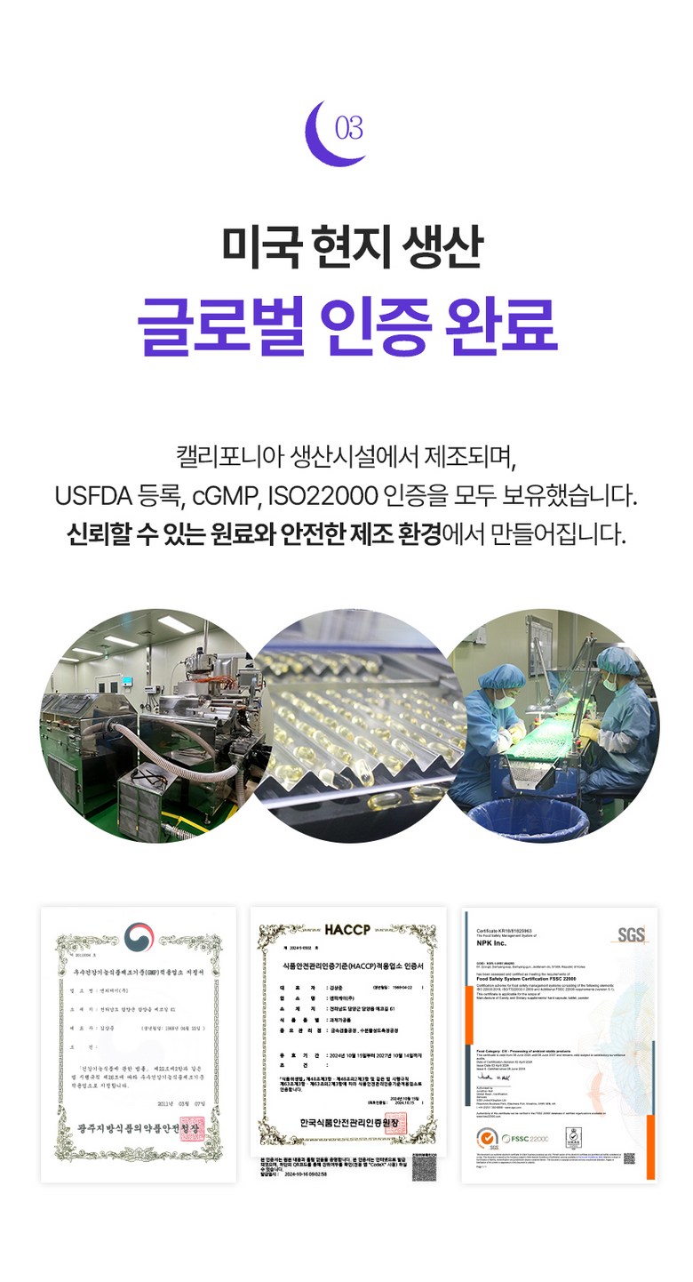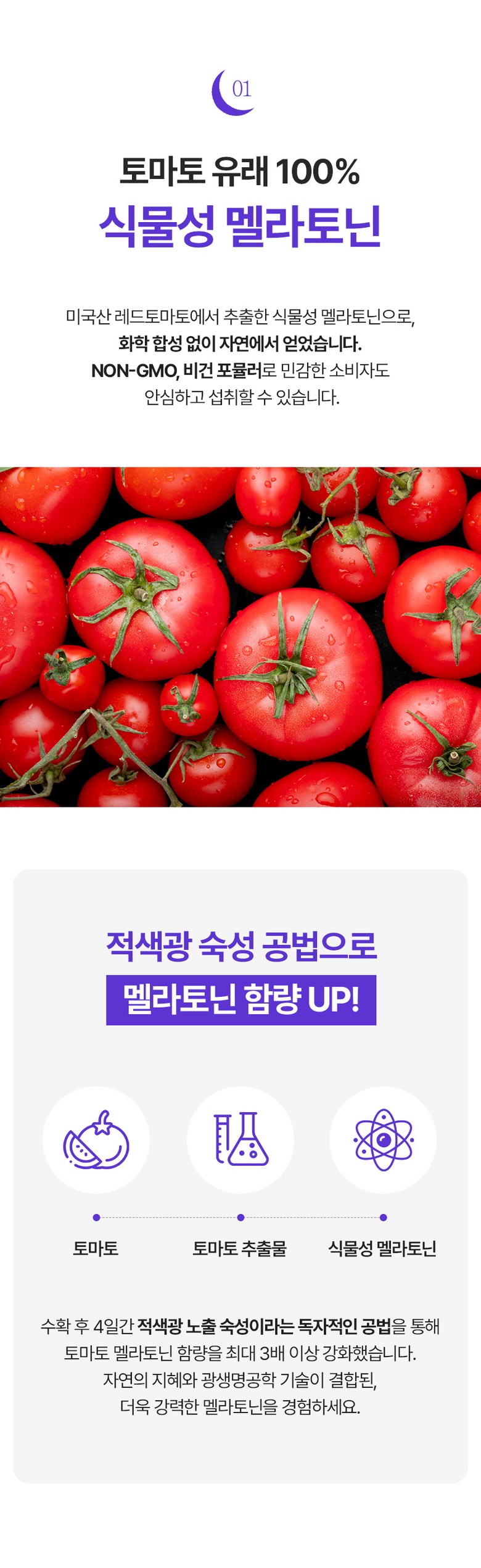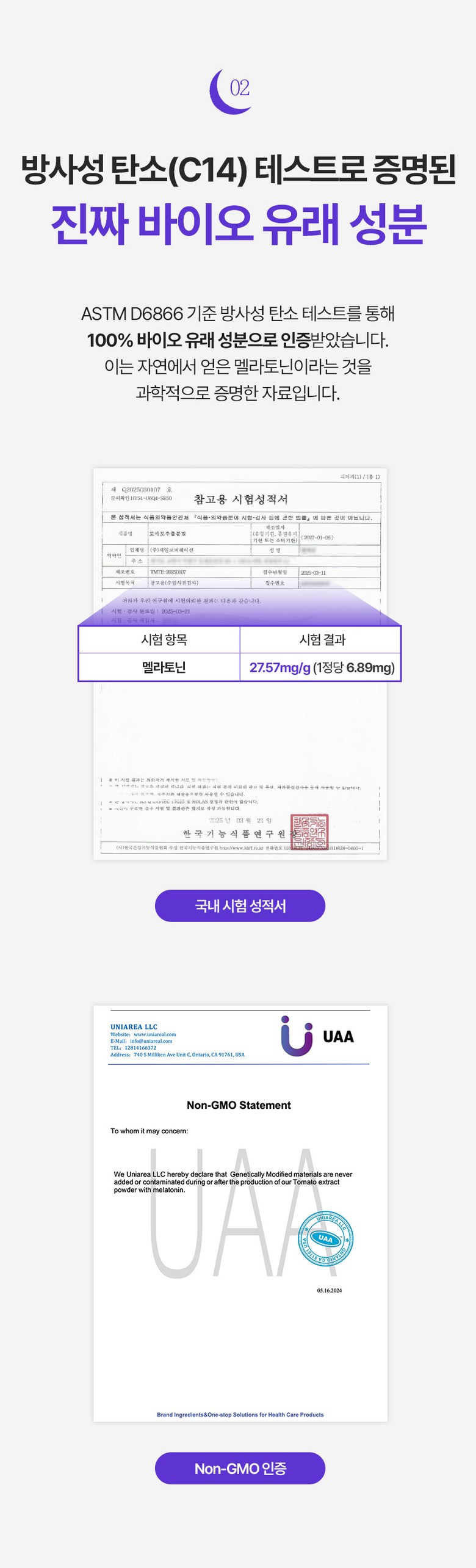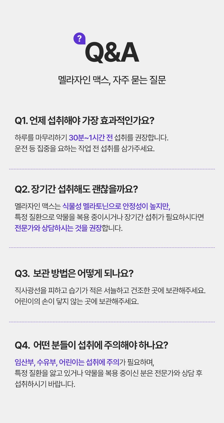 | 원재료명 및 함량 | 식물성 멜라토닌(5mg), 산화마그네슘, 테아닌, 유청칼슘, 비타민D3, 타트체리농축분말, 감태추출분말, 미강추출분말, 레몬밤잎추출분말, 결정셀룰로스, 스테아린산마그네슘 등 | 영양성분 | 1정(500mg)당 열량 0kcal, 탄수화물 13g, 단백질 0g, 지방 0g, 나트륨 5mg, 멜라토닌 5mg |