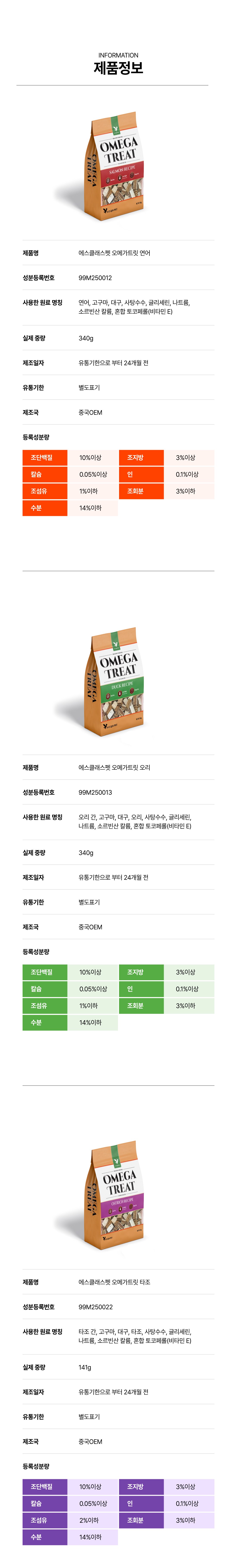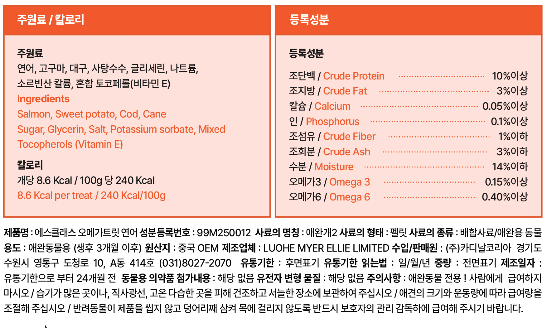 | 품명 및 모델명 | 에스클래스 오메가트릿 연어 | 인증/허가 사항 | 사료관리법에 따른 성분등록번호 : 컨텐츠 참조 |