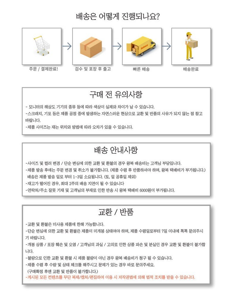 - ㆍ모니터 해상도의 차이로 인해 색상이나 이미지가 실제와 달라, 고객이 단순 변심으로 교환/반품을 무료로 요청하는 경우