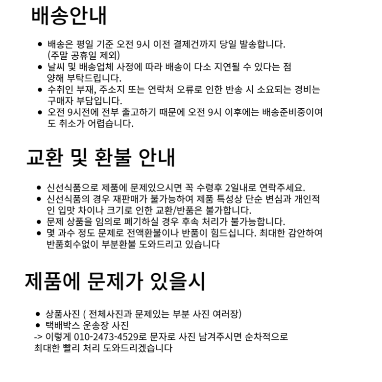| 배송방법 | 신선/냉장/냉동 | 배송비 | 무료배송 - 도서산간 지역 배송불가 |