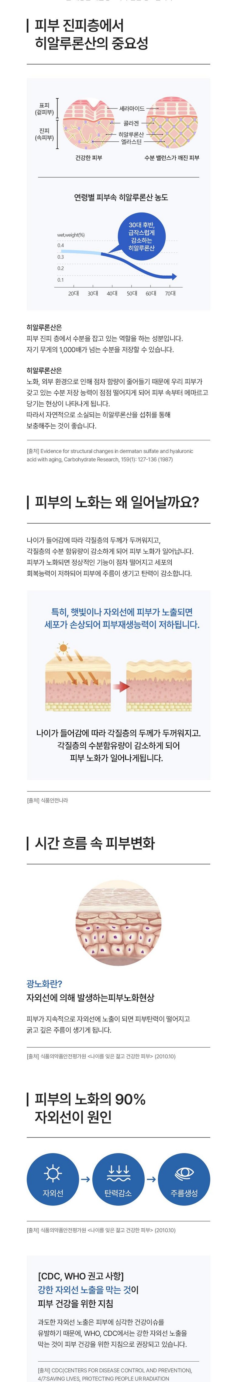 | 원료명 및 함량 | "히알루론산(히알루론산 90 %), 포도씨앗유, 생선콜라겐, 밀납, 대두레시틴, 우유단백질농축, 엘라스틴, 아미노산혼합제제(L-세린, 글리신, 분말결정포도당, L-알라닌) ※ 캡슐기제 : 젤라틴(우내피), 글리세린, D-소비톨액(감미료), 이산화티타늄(착색료), 에틸바닐린대두, 우유, 쇠고기 함유" | 영양정보 | ■ 1일 섭취량 당 함량 : 열량 10 kcal, 탄수화물 0 g (0 %), 단백질 0 g (0 %), 지방 1 g (2 %), 나트륨 15 mg (1 %), 히알루론산 240 mg |