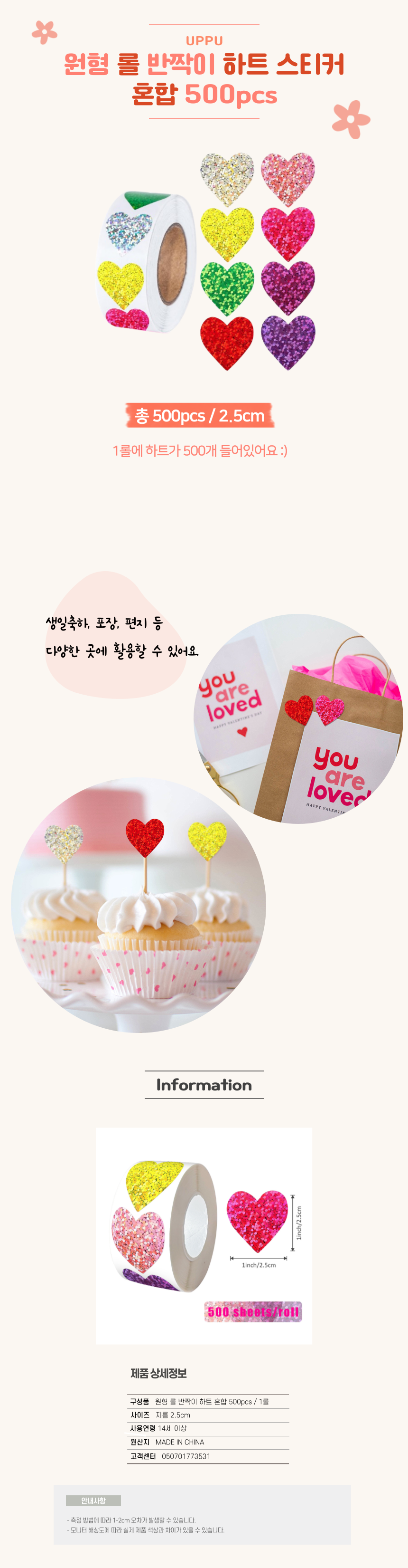 | 품명 및 모델명 | 어푸 원형 롤 반짝이 하트 스티커 혼합 1롤 500매 | 인증/허가 사항 | 해당없음(14세이상) |