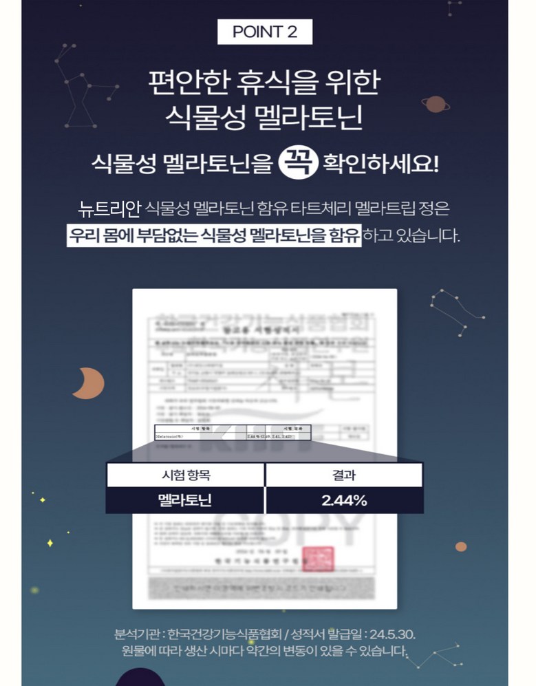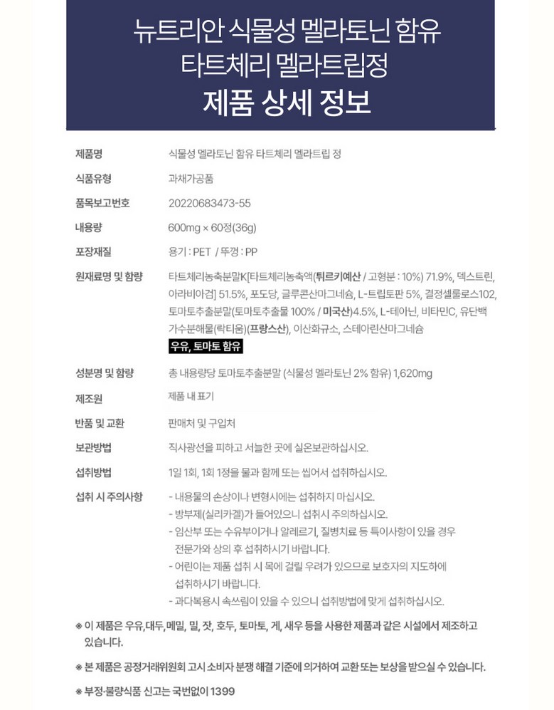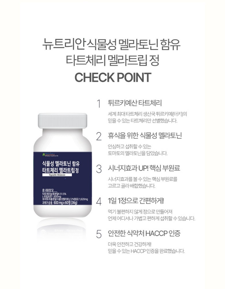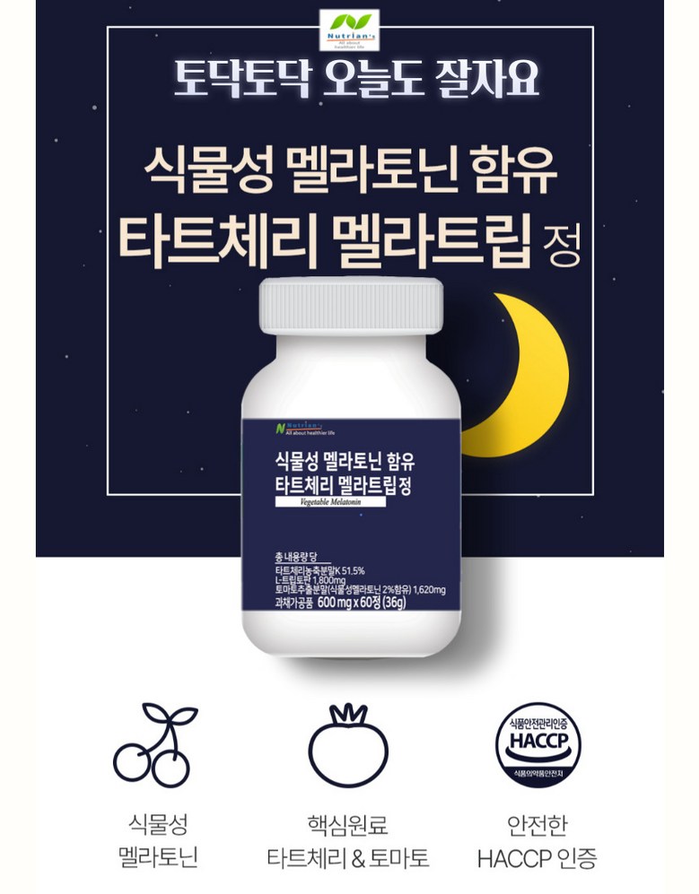 | 제품명 | 뉴트리안 식물성멜라토닌 타트체리 고함량 영양소 600mg | 식품의 유형 | 상품 상세페이지 참조 |