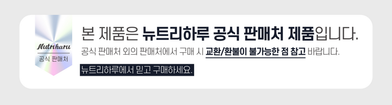 | 생산자 및 소재지 | 뉴트리하루 국내 협력사 스마트 HACCP 제조시설 제소 | 제조연월일, 소비기한 또는 품질유지기한 | 소비기한(또는 유통기한) : 2027년 05월 18일 이거나 그 이후인 상품 제조년월일 : 2025년 05월 19일 이후인 제조상품 |