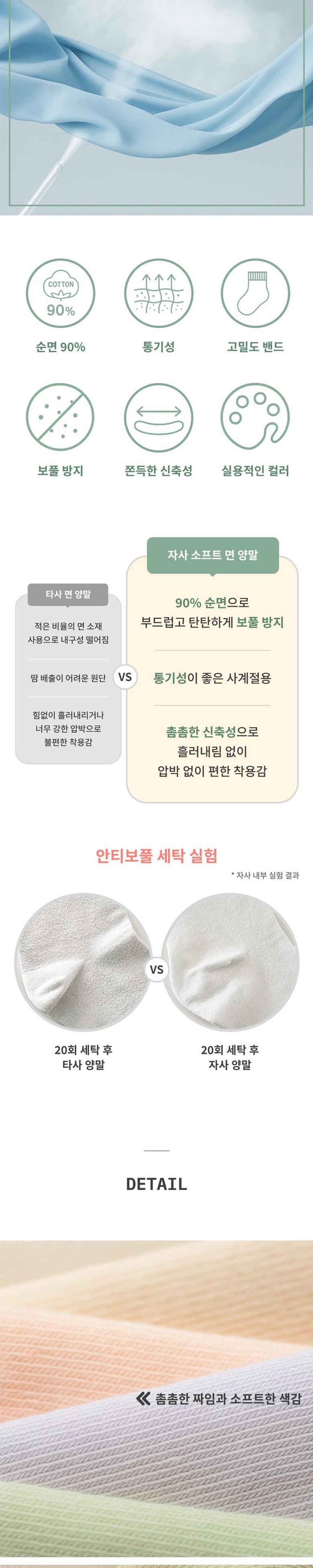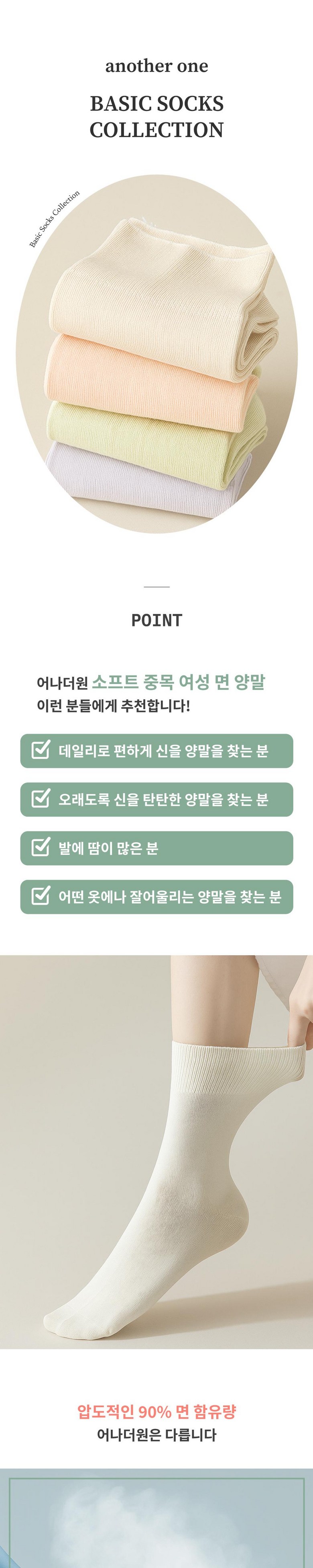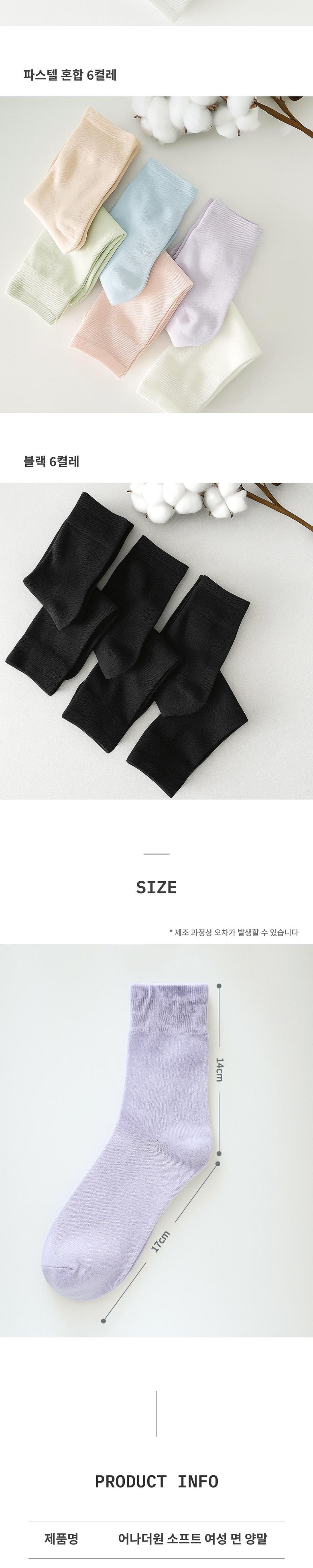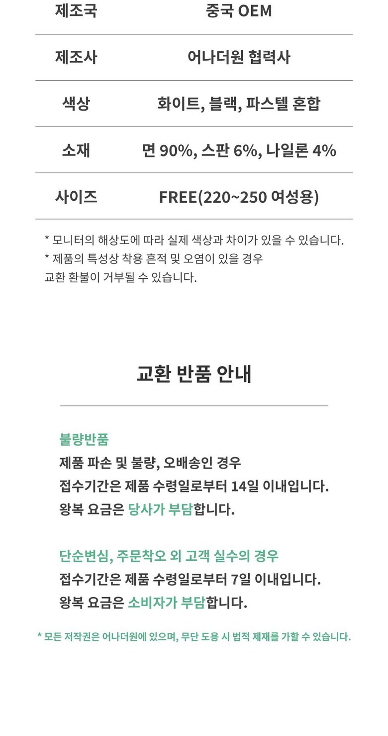 | 종류 | 어나더원 소프트 여성 면 양말 세트 | 소재 | 면 90%, 스판 6%, 나일론 4% |