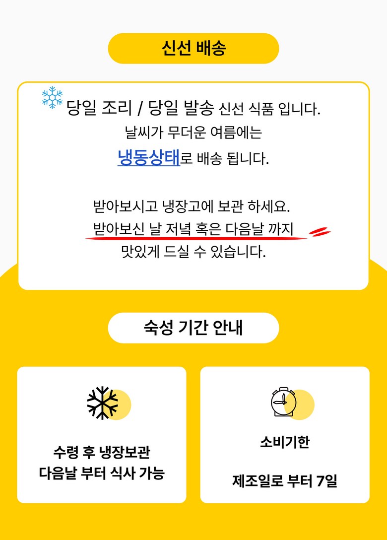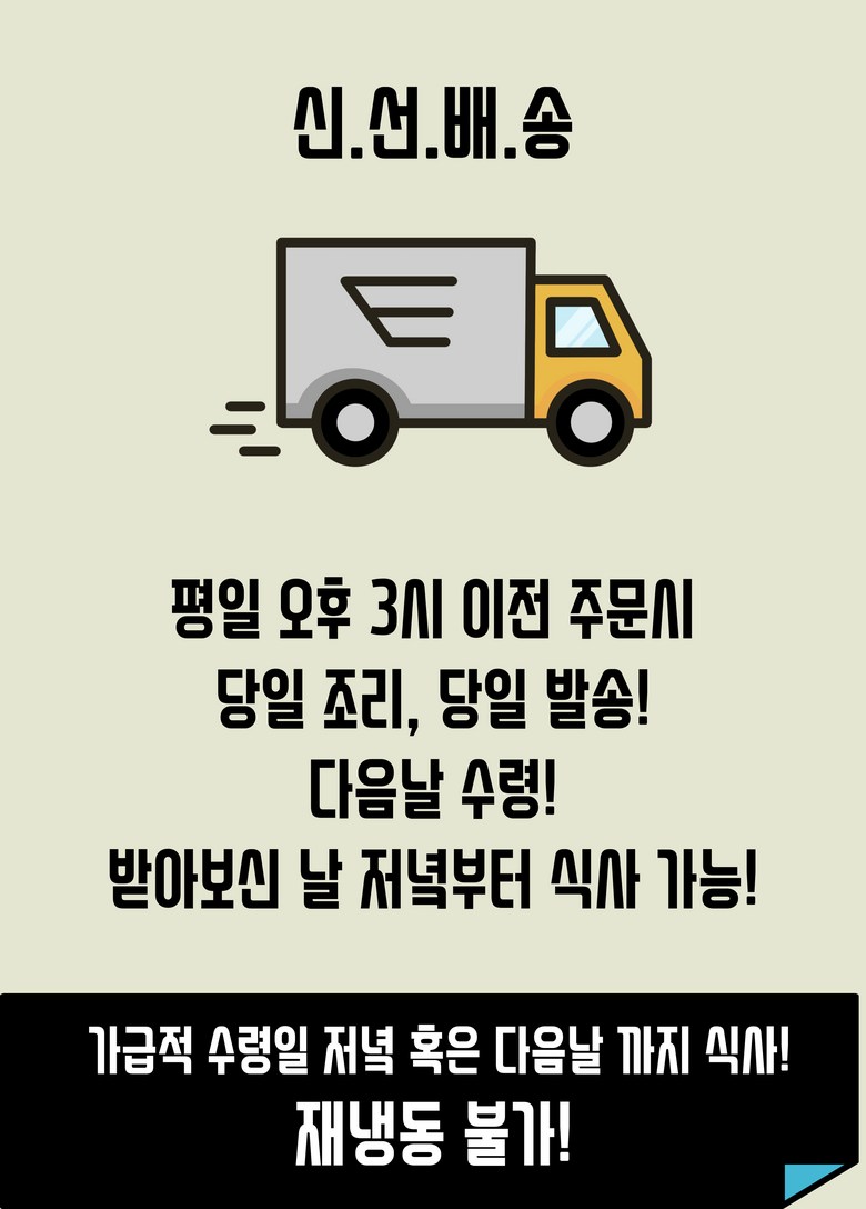 | 배송방법 | 신선/냉장/냉동 | 배송비 | 무료배송 · 도서산간 추가 배송비 - 제주 지역: 400원 - 도서산간 지역: 400원 |