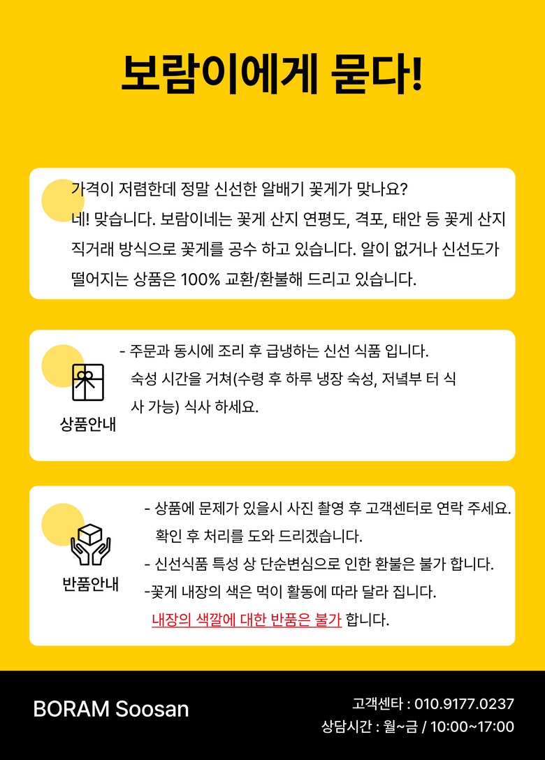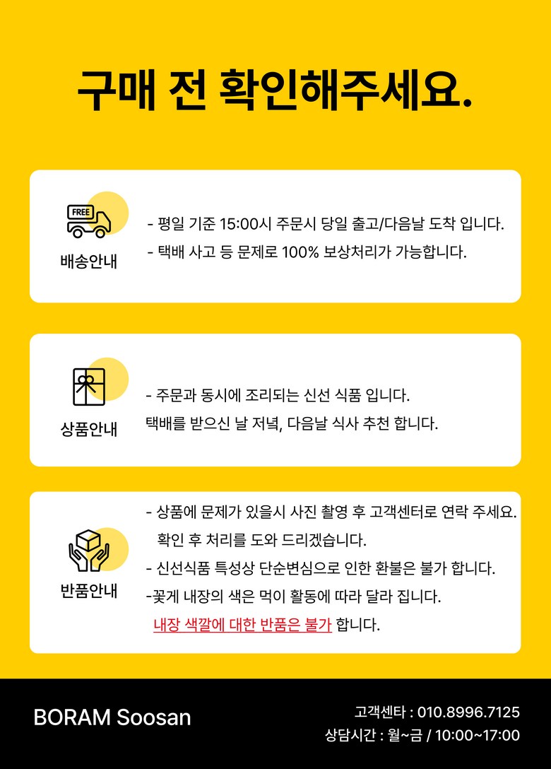 - ㆍ모니터 해상도의 차이로 인해 색상이나 이미지가 실제와 달라, 고객이 단순 변심으로 교환/반품을 무료로 요청하는 경우